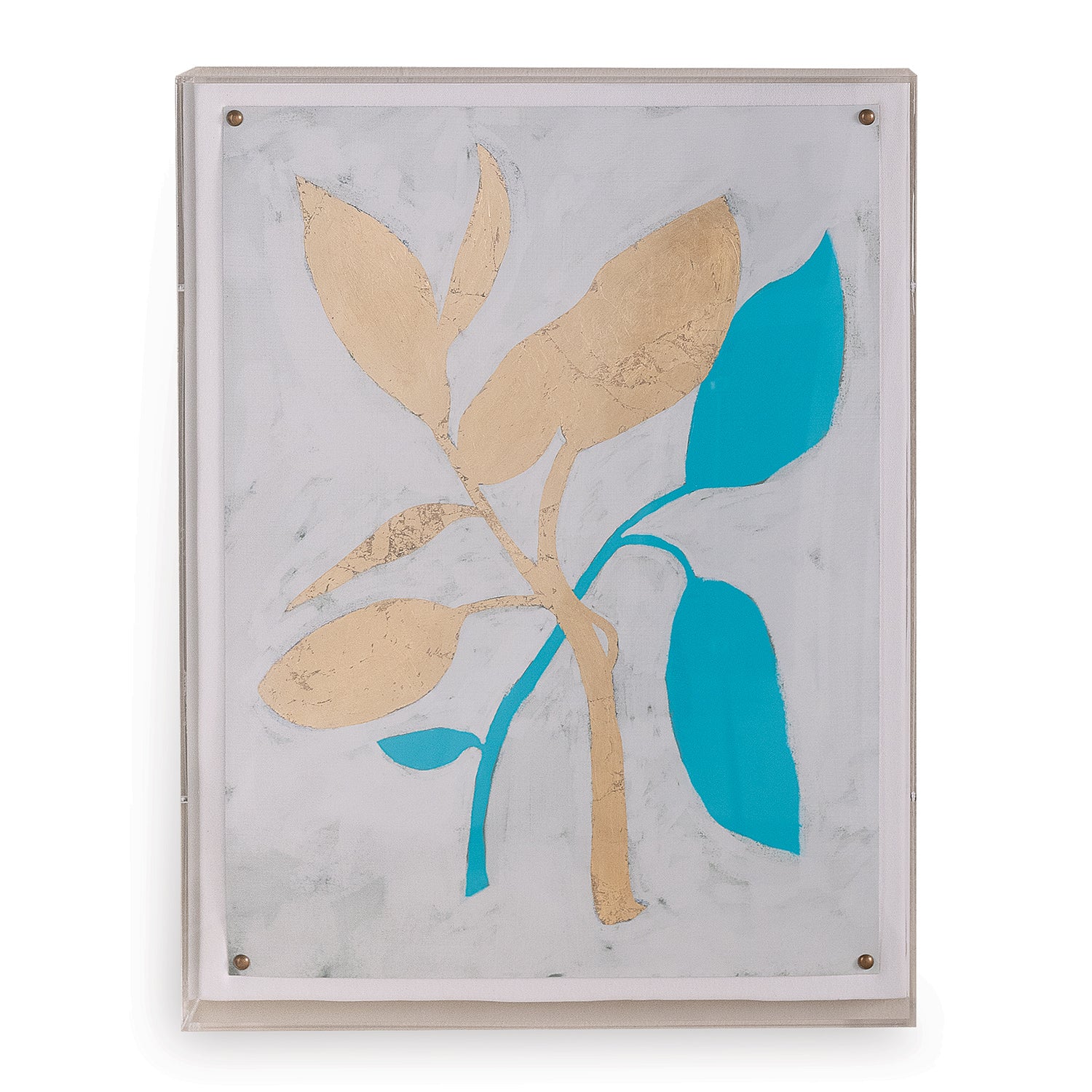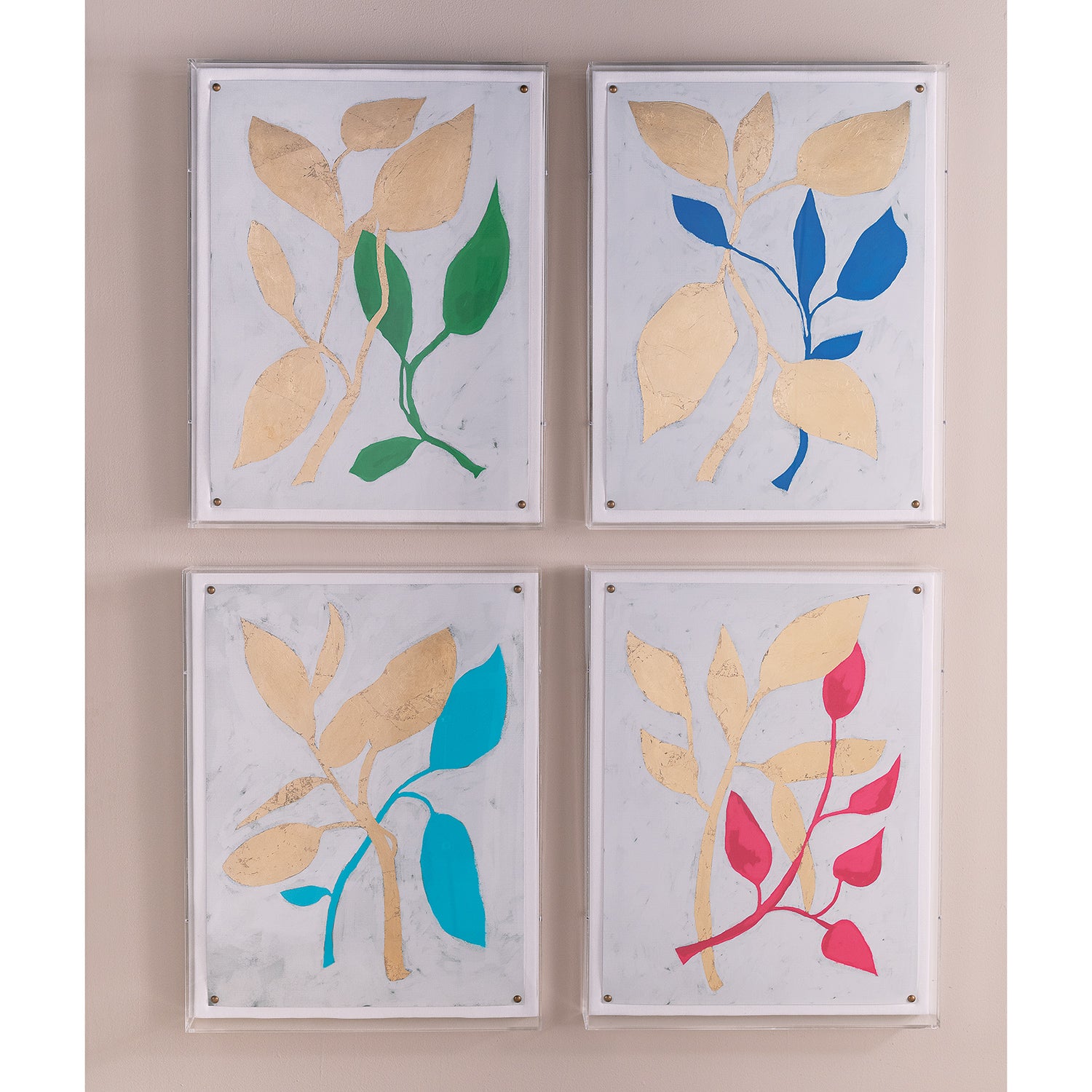 Our Tropic artwork is a whimsical dash of color with hand embellished gold leaf leaves. The artwork features a giclee print mounted under a 2.5 deep lucite shadow box. Attached to a linen wrapped interior panel, the artwork is finished with brass nailhead in each corner. Each print is hand embellished. Each panel is sold individually. Artwork may be hung individually, or as a set/4 with mates Tropic Fuchsia, ACJS-312-125; Tropic Blue, ACJS-312-126; Tropic Green, ACJS-312-127. Measurements: 26H x 20W x 2.5D Materials: acrylic frame, interior board mount, giclee paper print