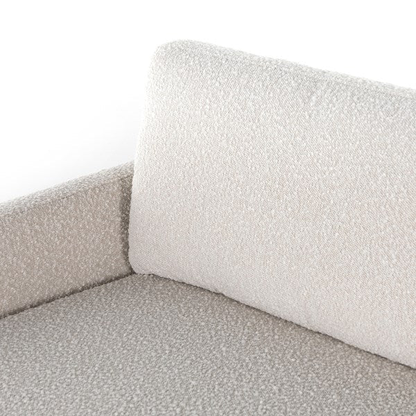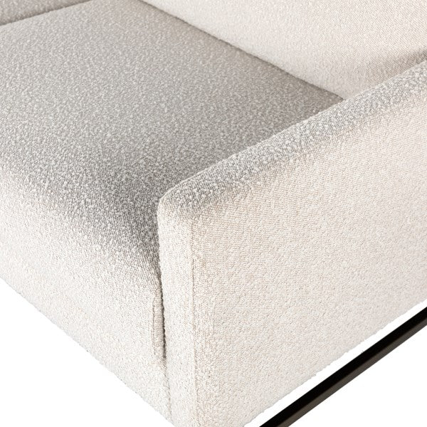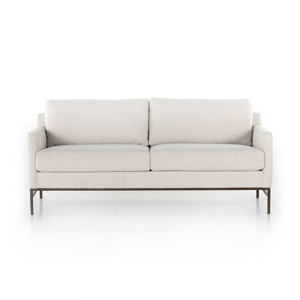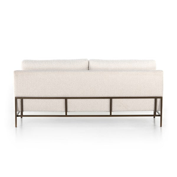 Plush and modern-minded. Atop an airy, bronze-finished iron base, thick, boucle-like upholstery features clean, angular track arms and comfy cushioning, for the best of both worlds.