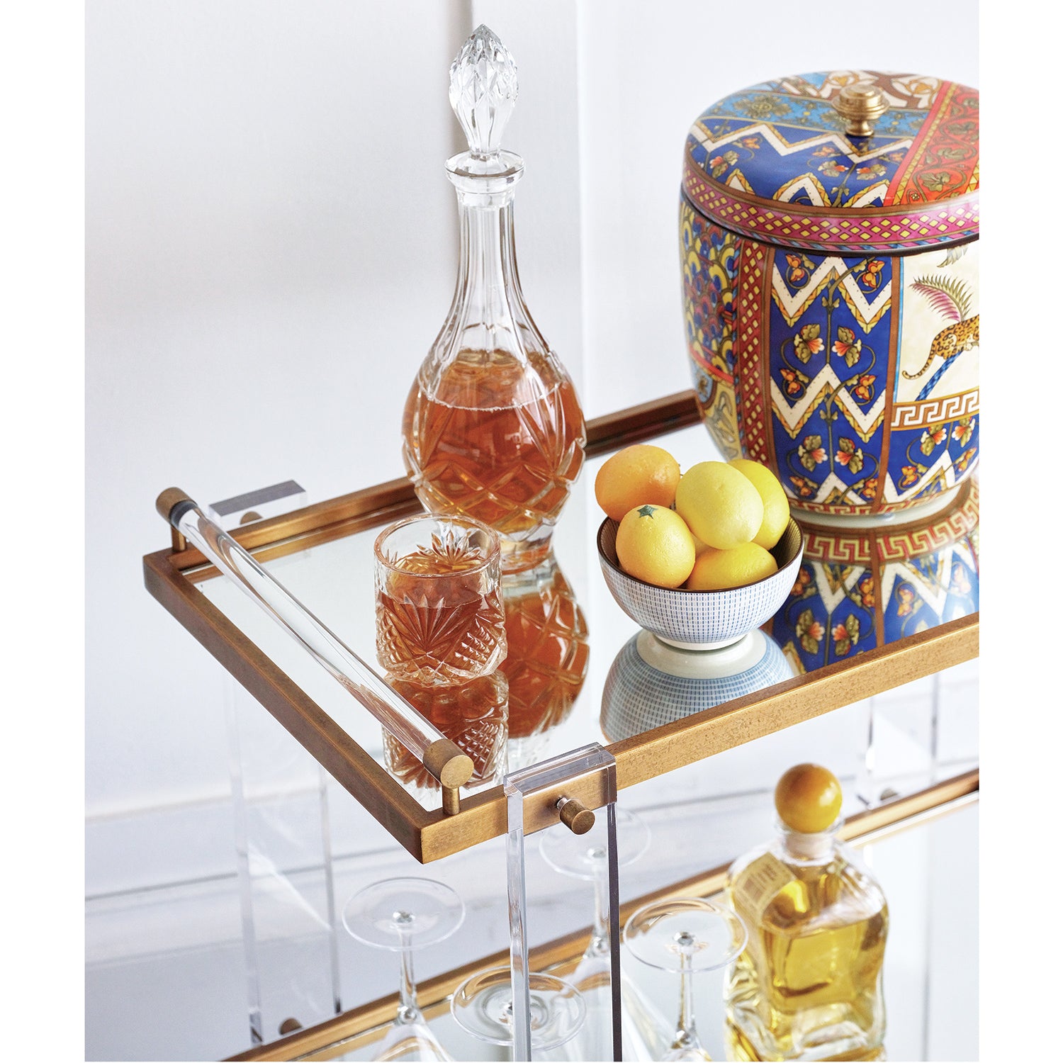 Tuscany is our entertaining bar/cart that features solid brass rolling feet, mirror tray tops accented with aged brass finished metal and lucite. Perfect for setting up home entertaining, the bar/cart makes it ever so easy to bring the drinks to the patio! Measurements: 32H x 28W x 17D. Materials: acrylic/lucite, metal, mirror Note: the Tuscany bar/cart is a freight ship item. The cart is fully assembled.