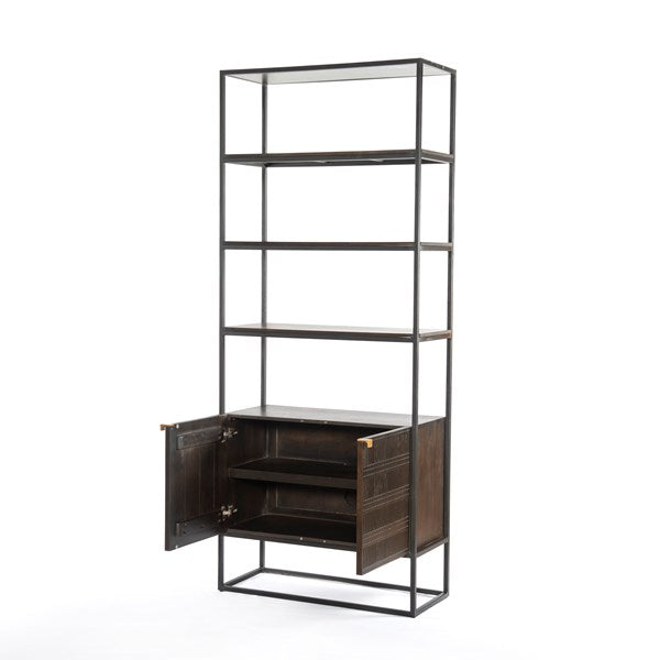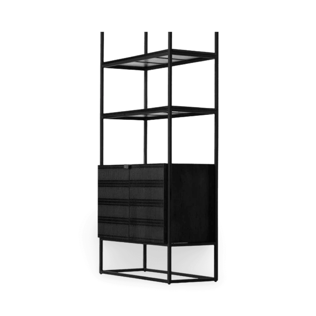 Uniquely carved mango wood is finished in a vintage brown, highlighting texture and craftsmanship, paired with a slim iron base for an airy, cage-like look.
