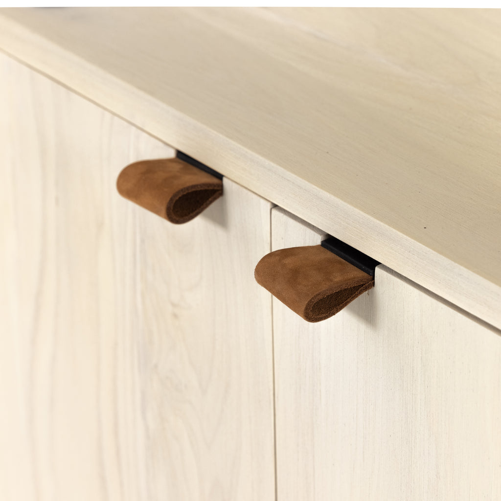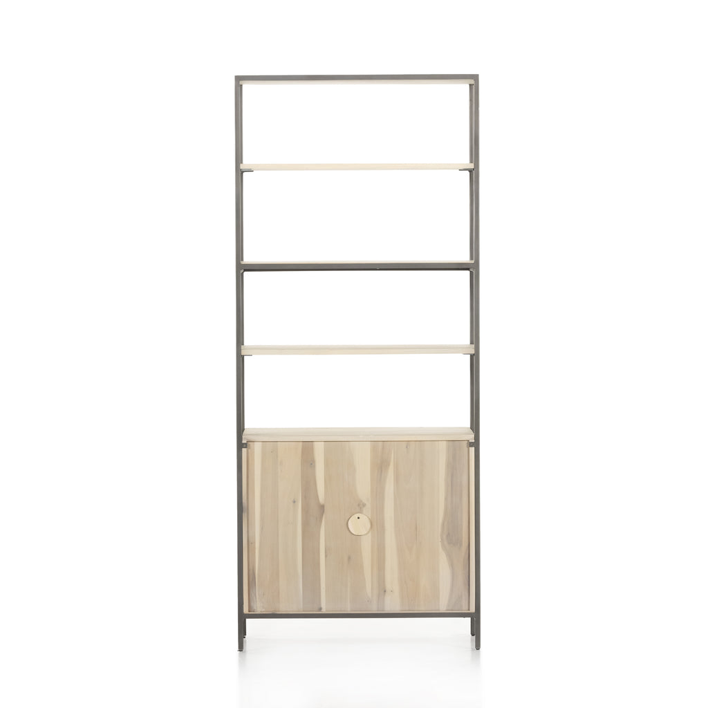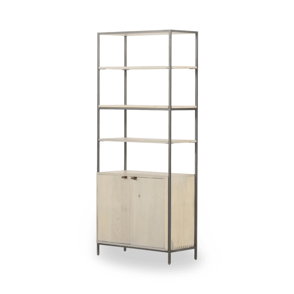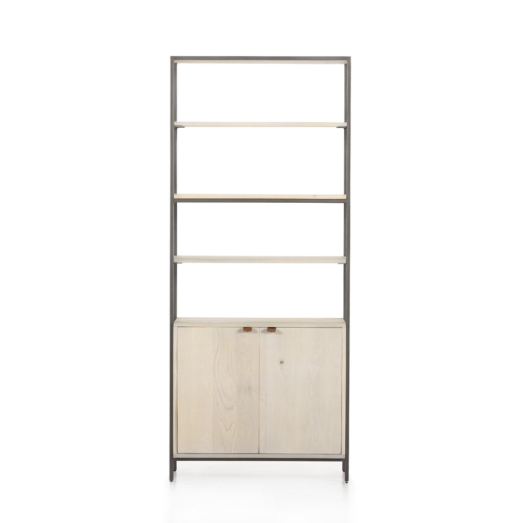 Inspired by clean midcentury design, solid poplar and raw iron fuse to offer storage and display space for favorite books and treasures. Metal-secured leather pulls add a textural element of surprise. Great alone or doubled and paired with matching media console.