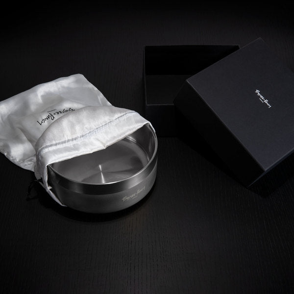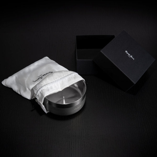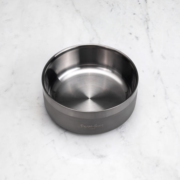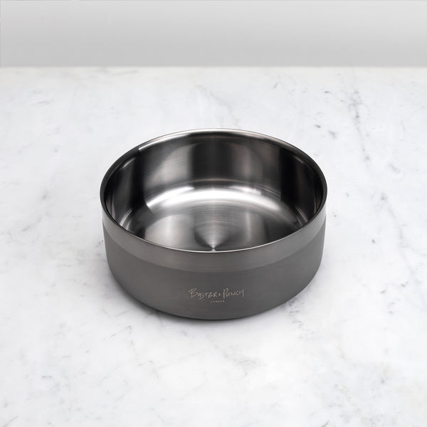 A dog bowl made from pressed stainless steel, in gun metal with a brushed and sandblasted finish, featuring a subtle, debossed B+P logo. A silicone bumper underneath prevents slippage. Our dog bowl comes in gift packaging, making it perfect for any dog lover to unbox.