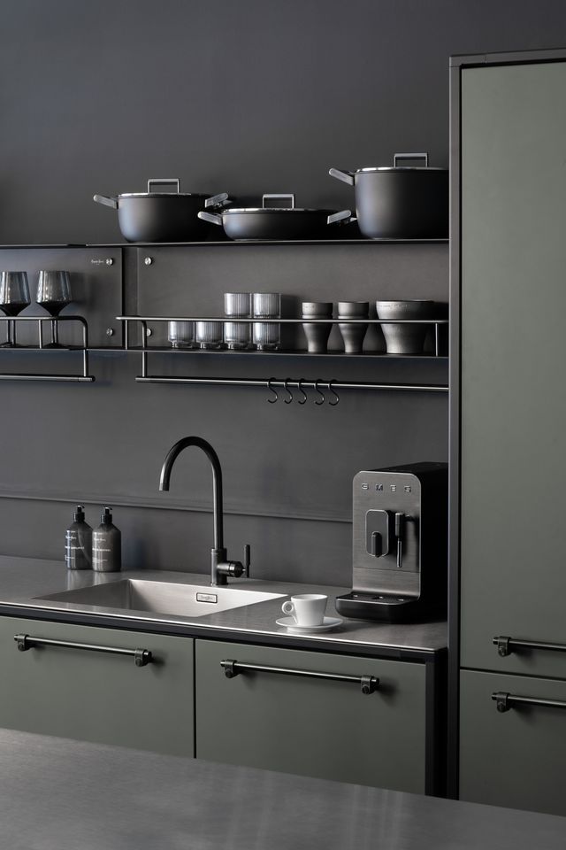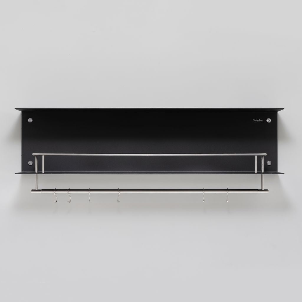 A shelf made from solid, powder coated metal with precisely engineered solid metal detailing. The heavy-duty shelf is made from laser cut 0.16Ó sheet aluminum, press bent into shape and powder coated. It features a 0.5Ó hand polished solid metal guard rail and 0.9Ó solid metal pan rail. ItÕs finished with our signature matching coin screws. Use in a kitchen to organize and arrange pots, pans, plates, glasses and utensils. Or use in a bathroom to hold and hang towels, ointments, colognes, mirrors and body lotions. Please note, fixing screws are not supplied with the shelves. You will need to source fixings and screws suitable for the wall you are installing the shelf on. Maximum load: 30kg