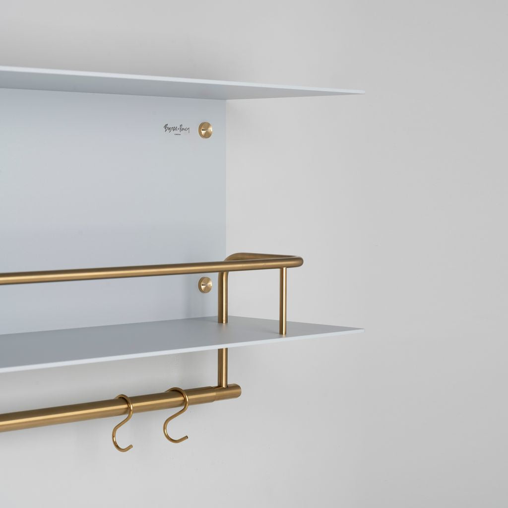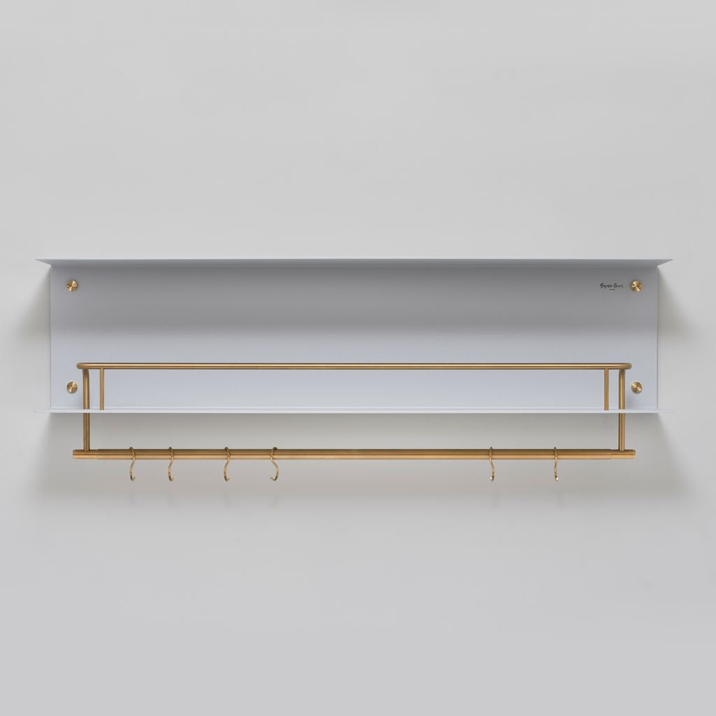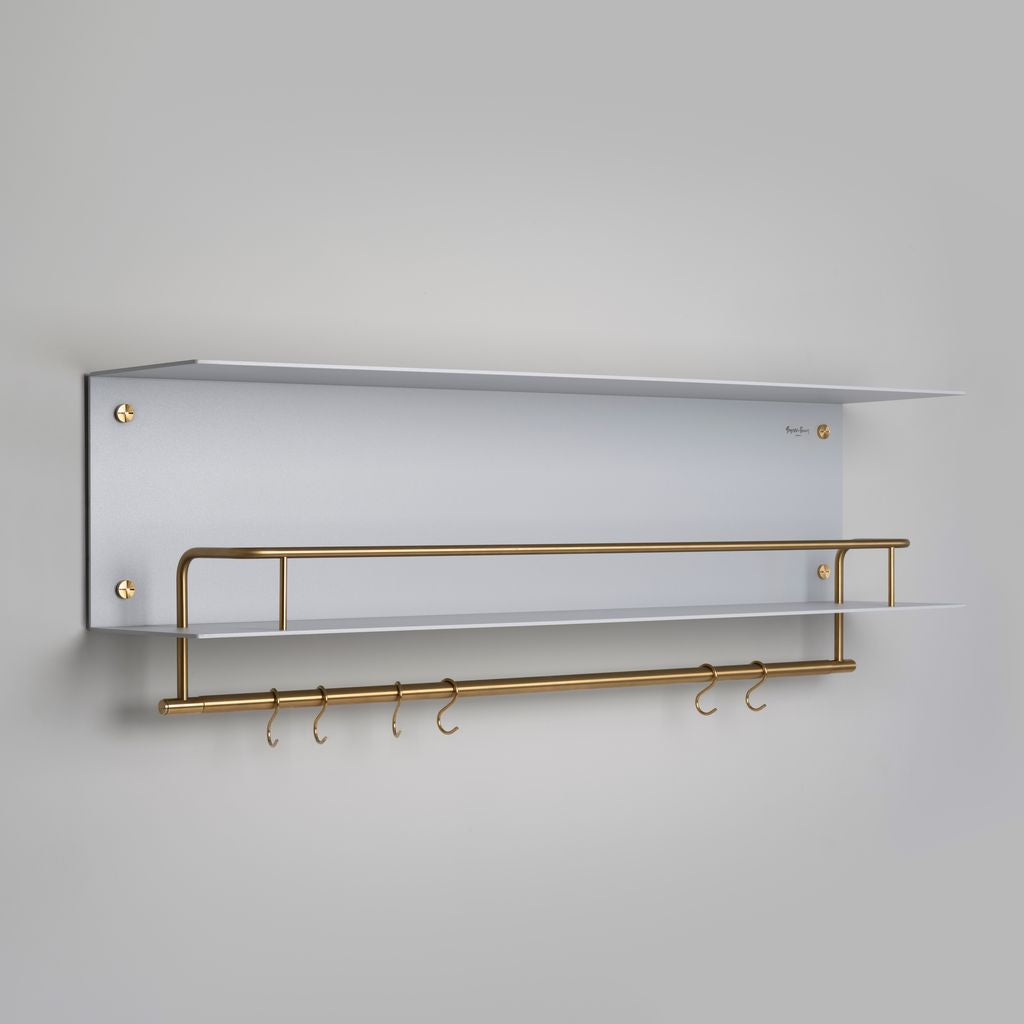 A shelf made from solid, powder coated metal with precisely engineered solid metal detailing. The heavy-duty shelf is made from laser cut 0.16Ó sheet aluminum, press bent into shape and powder coated. It features a 0.5Ó hand polished solid metal guard rail and 0.9Ó solid metal pan rail. ItÕs finished with our signature matching coin screws. Use in a kitchen to organize and arrange pots, pans, plates, glasses and utensils. Or use in a bathroom to hold and hang towels, ointments, colognes, mirrors and body lotions. Please note, fixing screws are not supplied with the shelves. You will need to source fixings and screws suitable for the wall you are installing the shelf on. Maximum load: 30kg