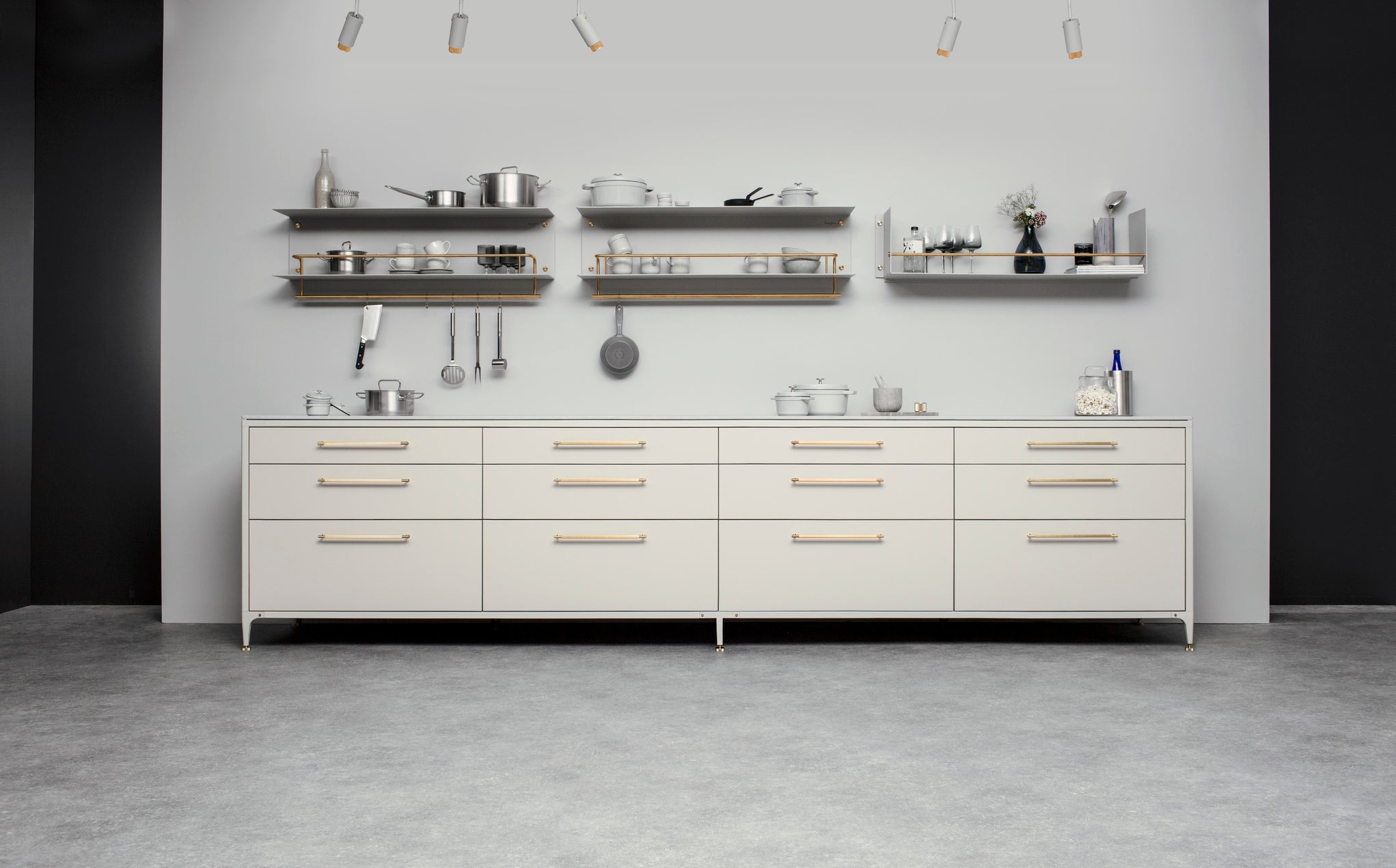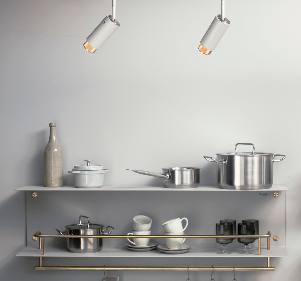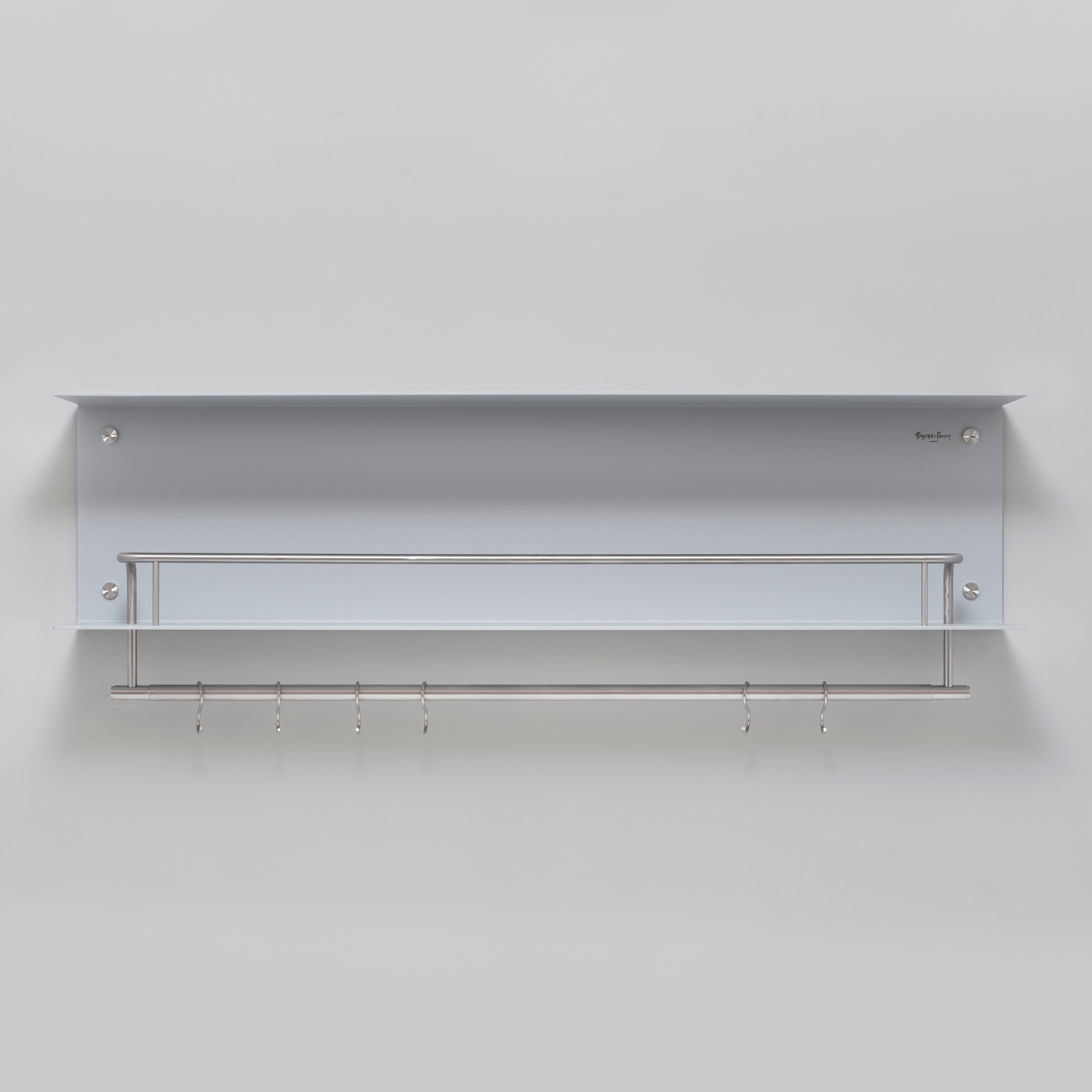 A shelf made from solid, powder coated metal with precisely engineered solid metal detailing. The heavy-duty shelf is made from laser cut 0.16Ó sheet aluminum, press bent into shape and powder coated. It features a 0.5Ó hand polished solid metal guard rail and 0.9Ó solid metal pan rail. ItÕs finished with our signature matching coin screws. Use in a kitchen to organize and arrange pots, pans, plates, glasses and utensils. Or use in a bathroom to hold and hang towels, ointments, colognes, mirrors and body lotions. Please note, fixing screws are not supplied with the shelves. You will need to source fixings and screws suitable for the wall you are installing the shelf on. Maximum load: 30kg
