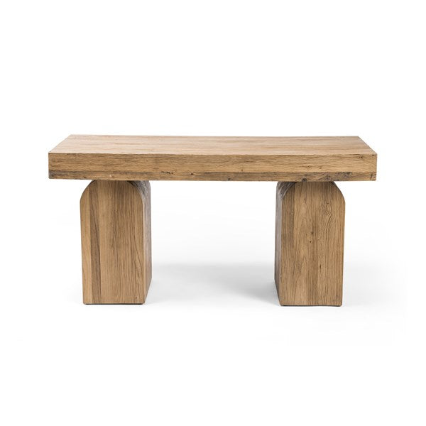 A study in shape. Handcrafted from solid reclaimed elm with visible knots and graining, chunky arched legs support a rectangular desktop with a spacious single drawer. Finished back grants the option to float desk anywhere in room.
