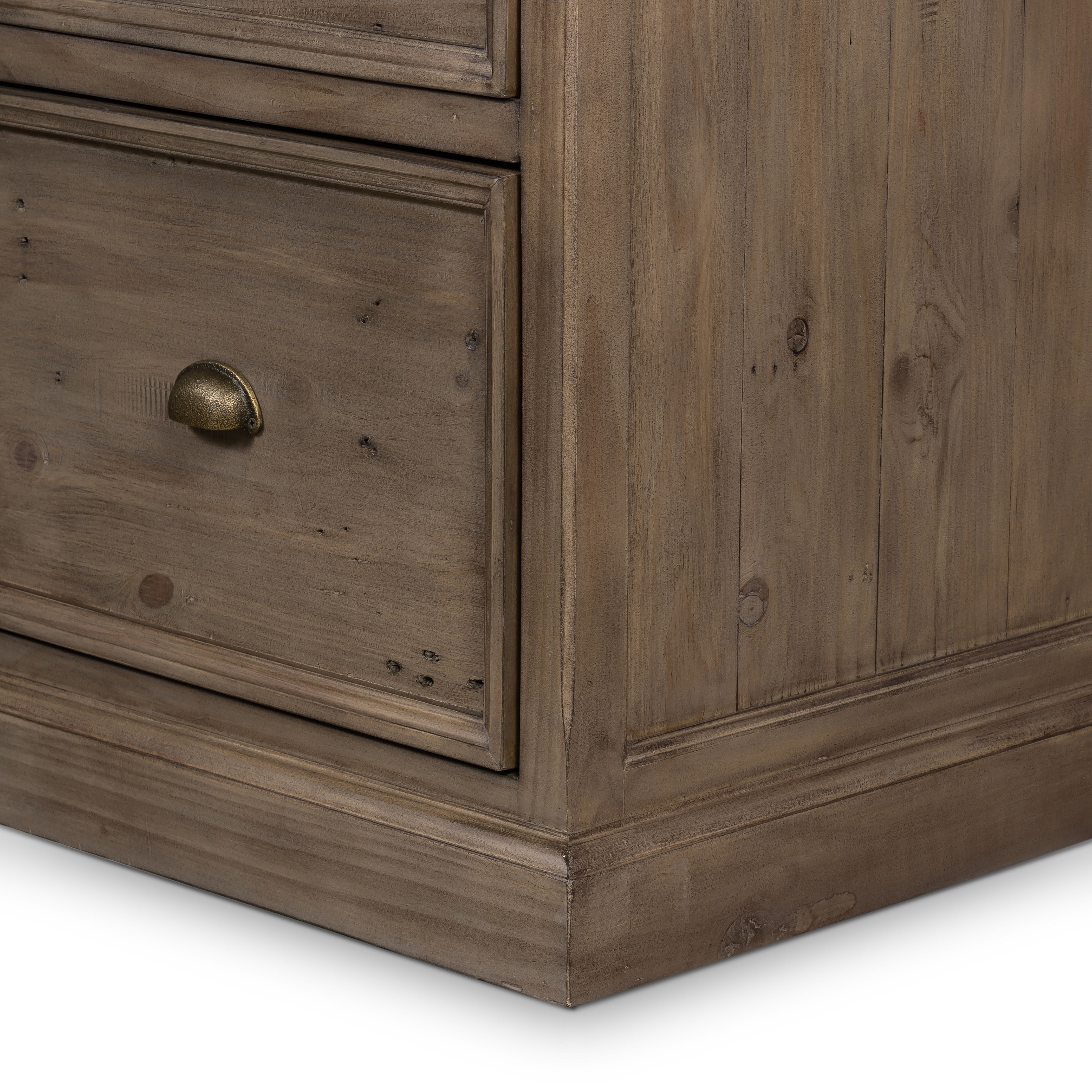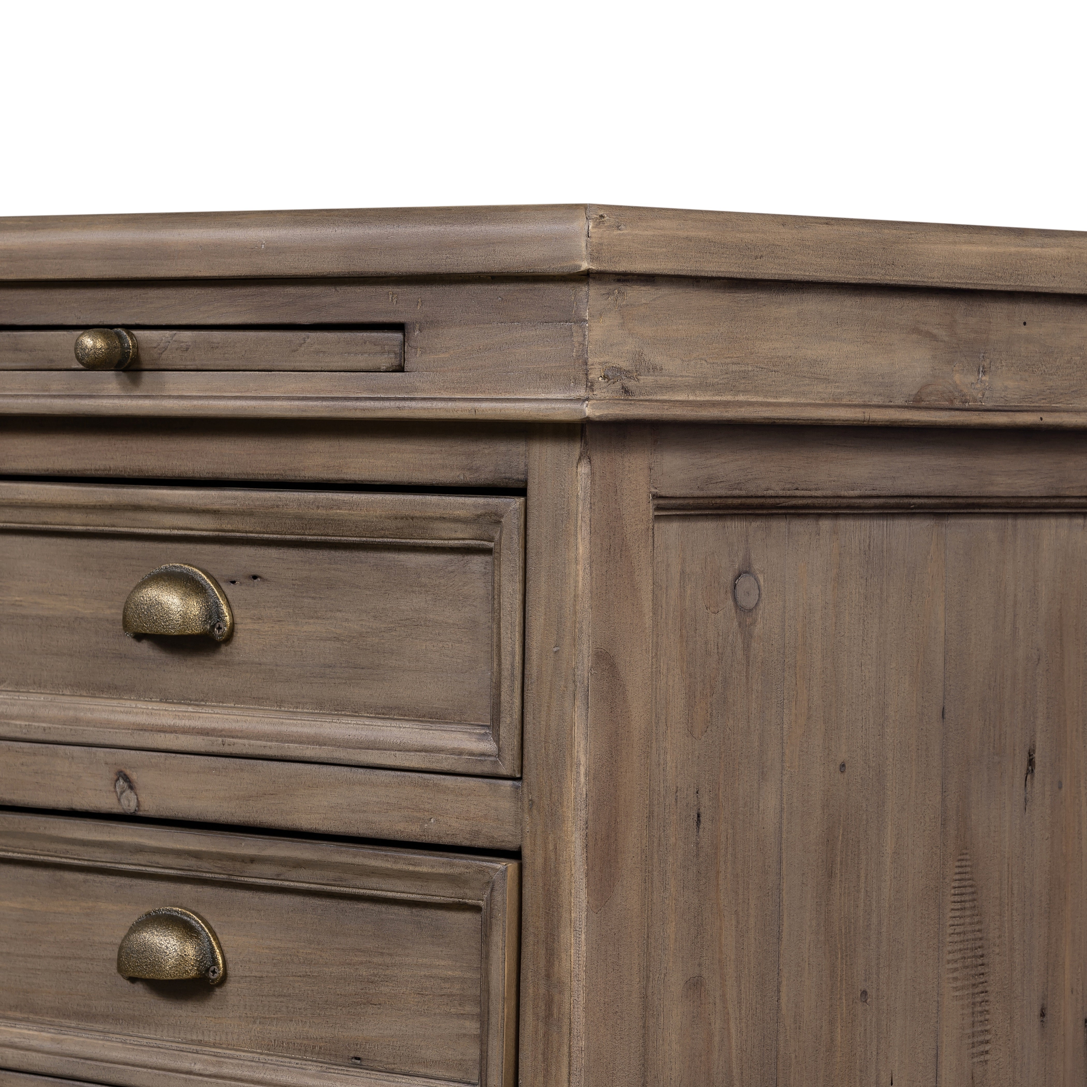 Borrowing inspiration from the classic lawyer's desk with an inlaid leather top and French-inspired detailing. Finished in warm, sun-dried wheat tones with cast brass hardware, with file dual file drawers for storage of legal and letter sized documents.
