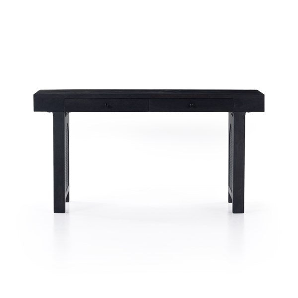Black-washed mango encases textural cane door panels featuring black-finished iron hardware, meeting a forward-thinking material mix with sleek monochromatic vibes. Dual drawers keep frequently used office materials in close reach.