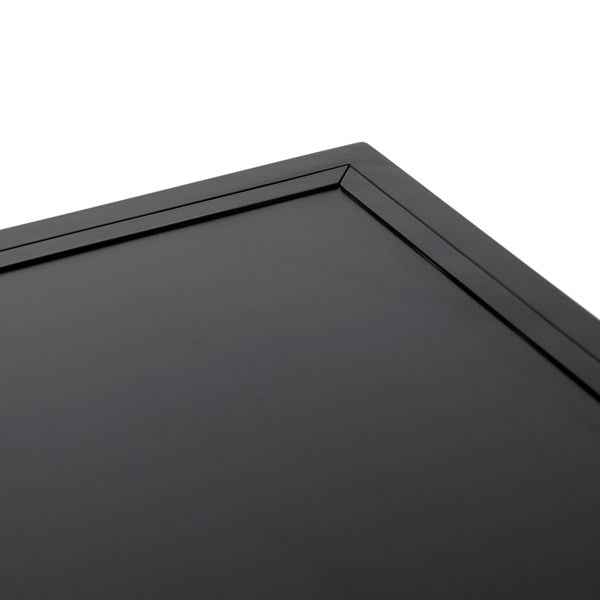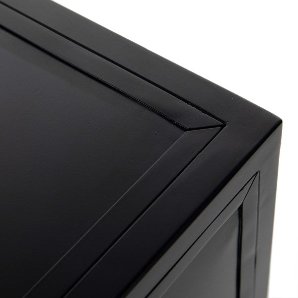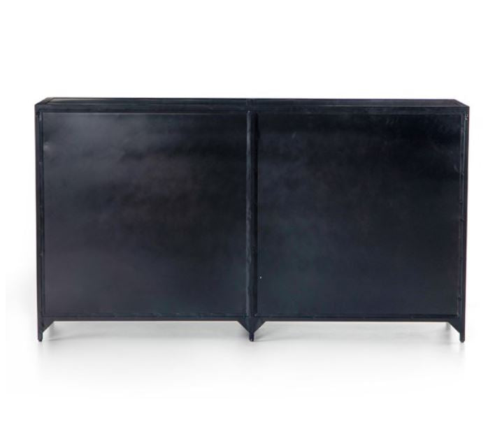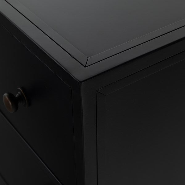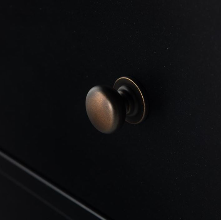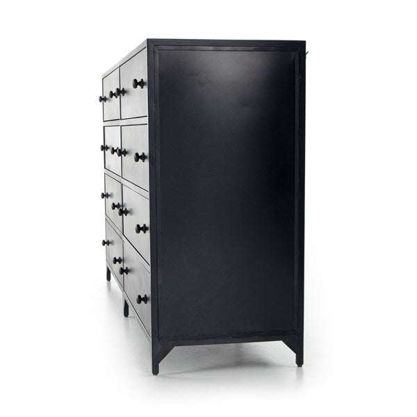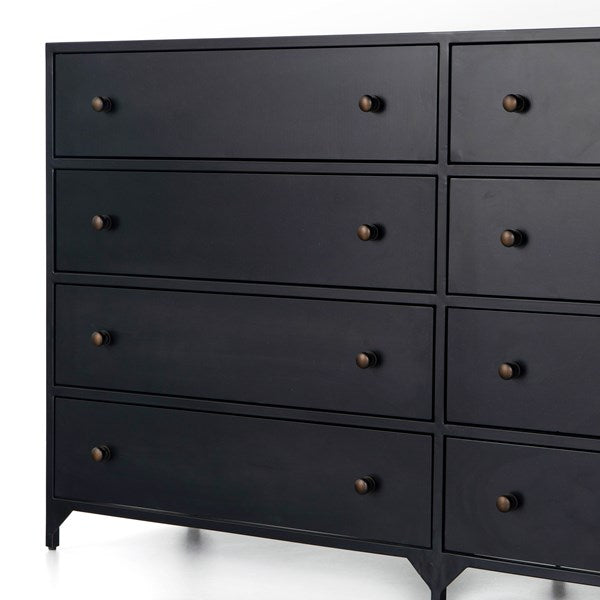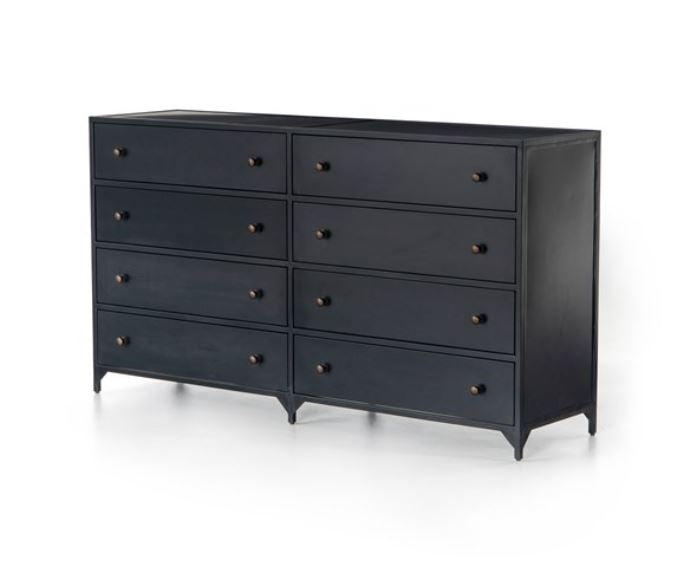Sleek and industrial-inspired, black iron forms a spacious eight-drawer dresser, with and brass knobs for cool contrast.