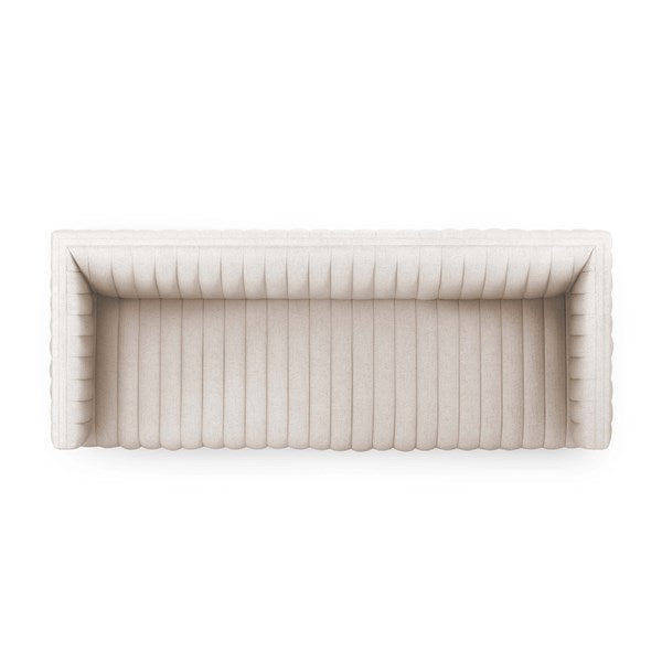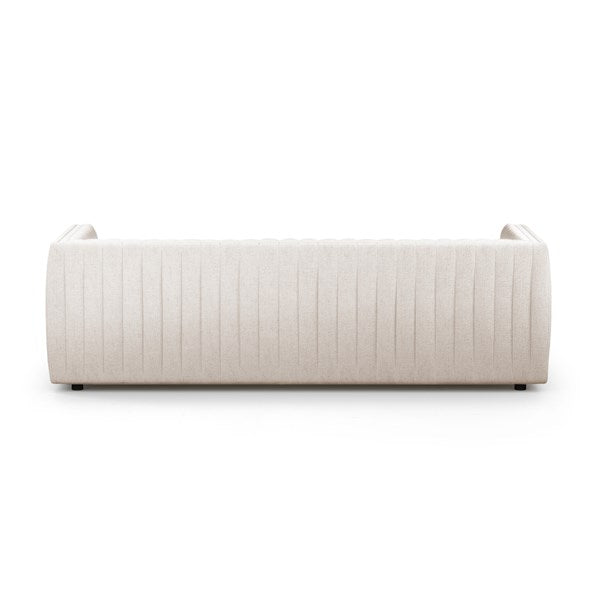A dramatically channeled sofa with dover crescent linen-blend upholstery offers a crisp, clean look and sumptuous sit. Performance fabrics are specially created to withstand spills, stains, high traffic and wear, ensuring long-term comfort and unmatched durability.