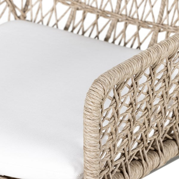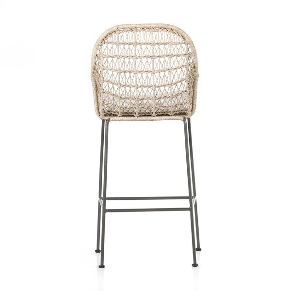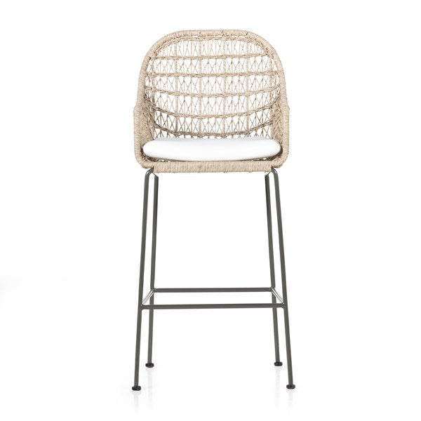 Clean, contemporary shaping and an updated weave transform all-weather wicker into something modern. This high-texture bar stool is supported by a contrasting bronzed iron base, with a white seat cushion for comfort. Cover or store indoors during inclement weather and when not in use.