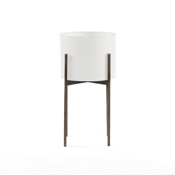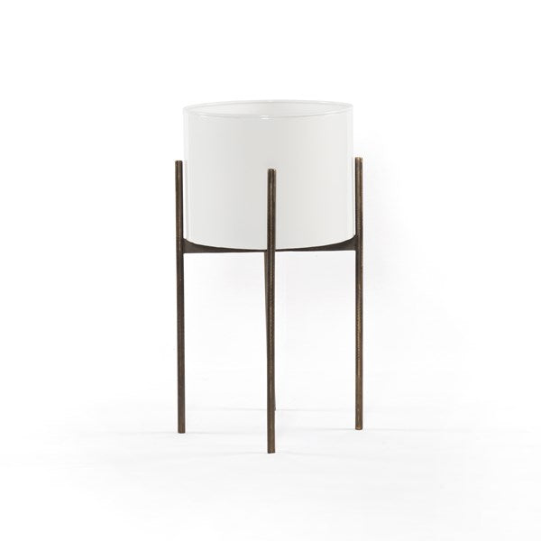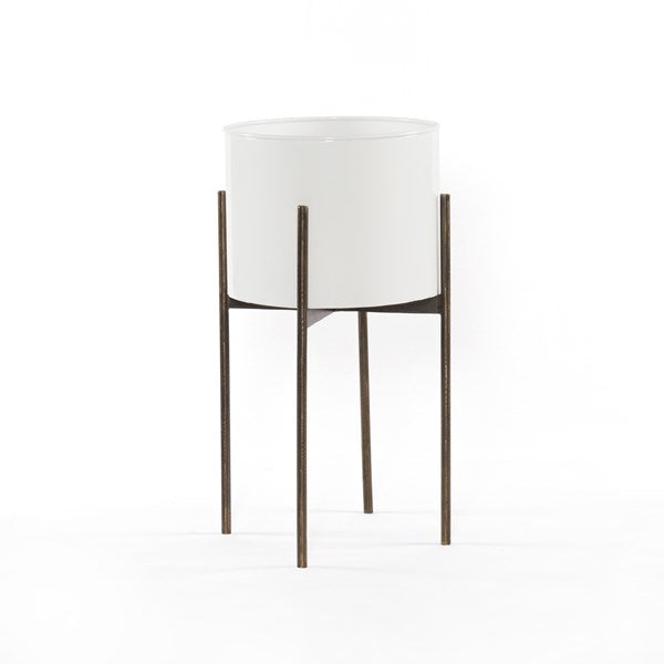 Slim legs of weathered brass-finished iron support an inset planter of glossy white iron. Plastic plant liner recommended (not included). Cover or store indoors during inclement weather and when not in use.