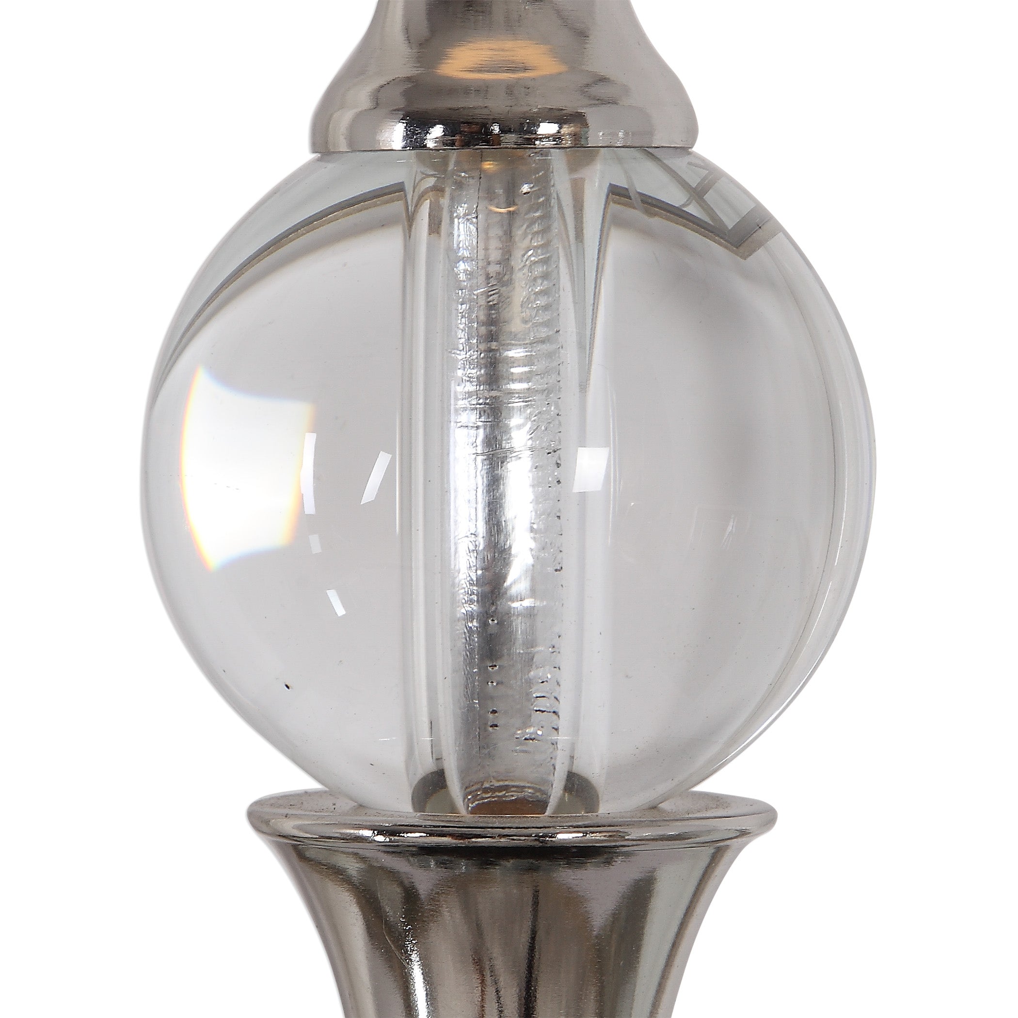 Add A Touch Of Whimsical Style To A Space With This Buffet Lamp Design By Featuring A Decorative Ceramic Calla Lilies Bouquet Finished In A Blue Gray Glaze, Paired With Crystal Accents And Polished Nickel Plated Details. A Round Hardback Drum Shade In White Linen Fabric Complements This Piece.