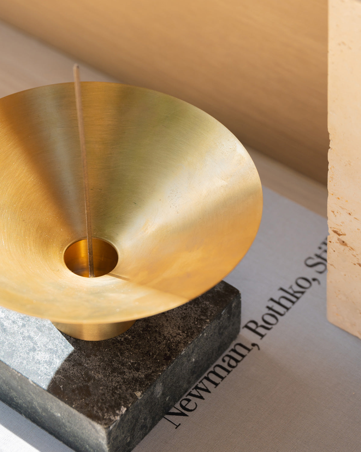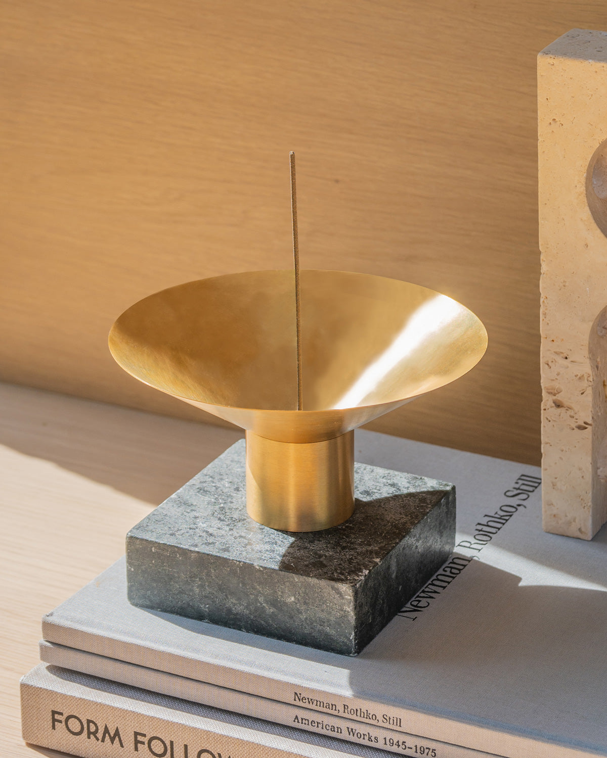 Catch and Release is an incense burner designed to symbolize the capture of fleeting moments. As the incense burns, the ash gracefully funnels into the base, symbolically preserving the essence of time. The burner features two elegantly nested brass forms that combine to create both a sculptural and functional piece, seamlessly blending art and utility