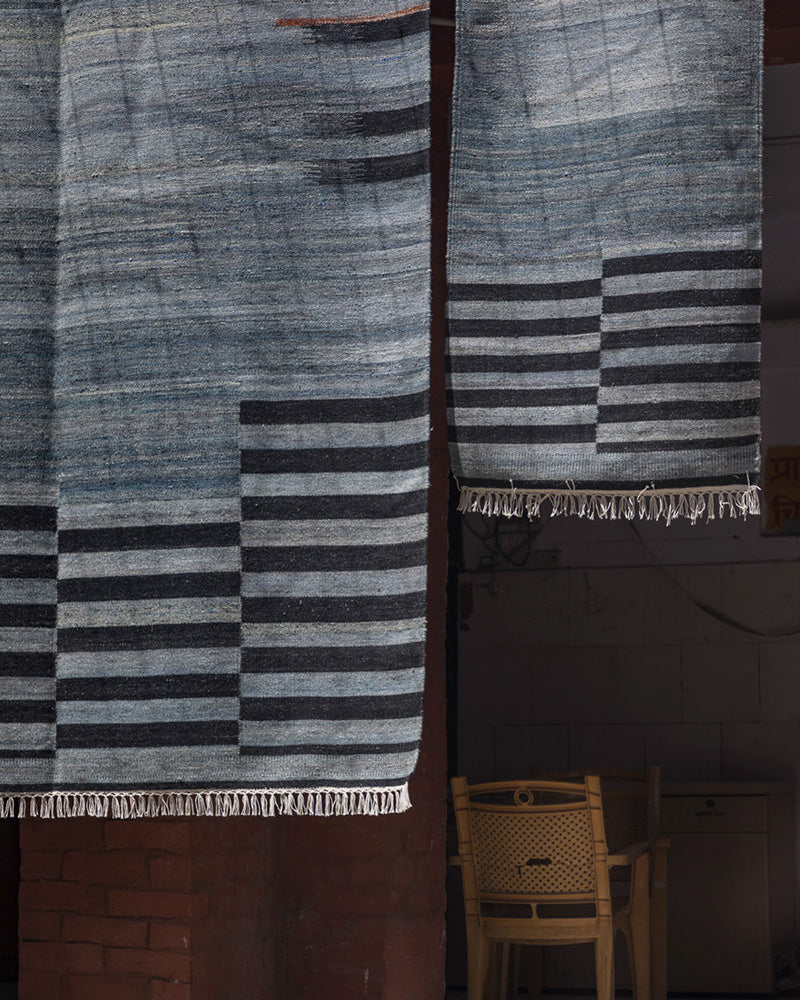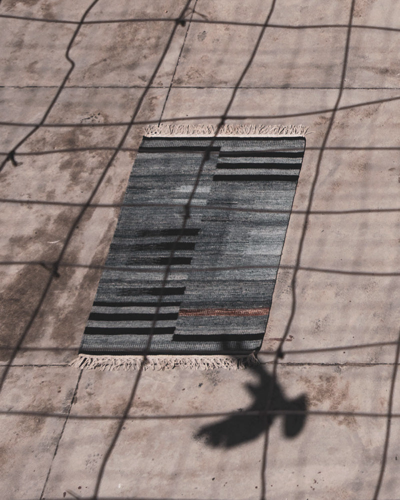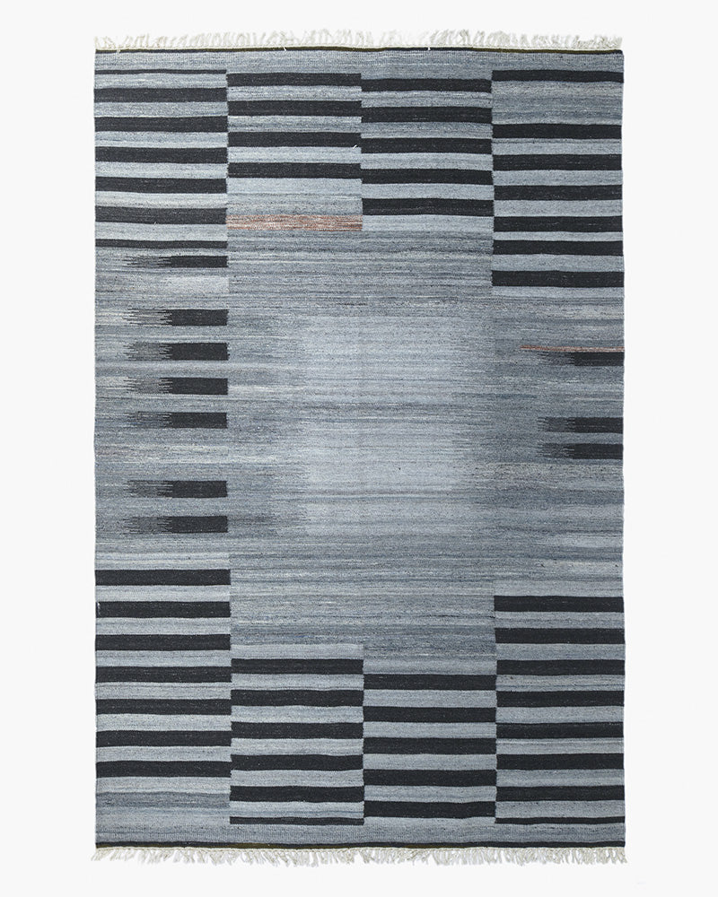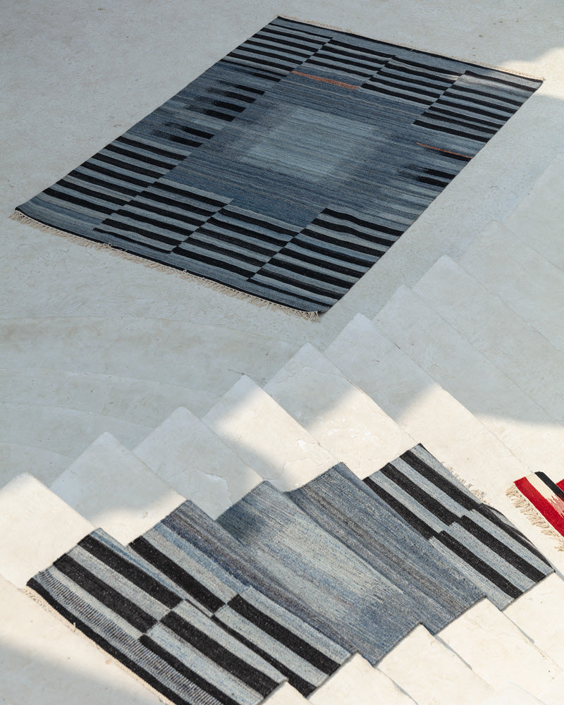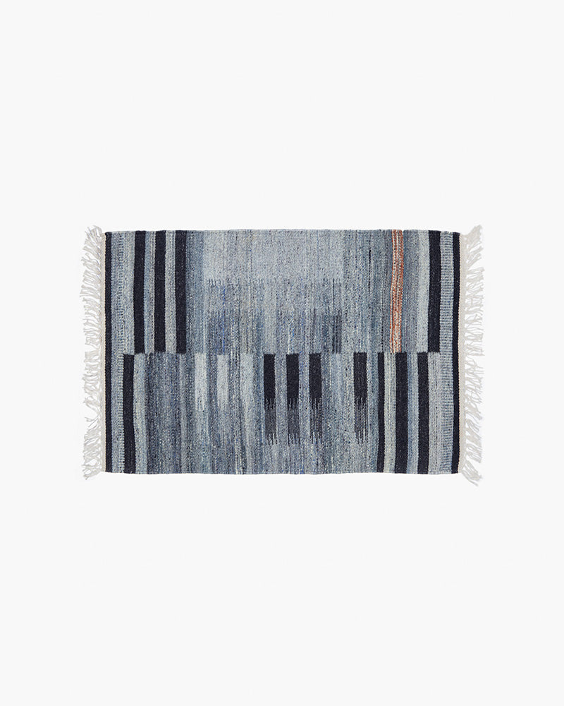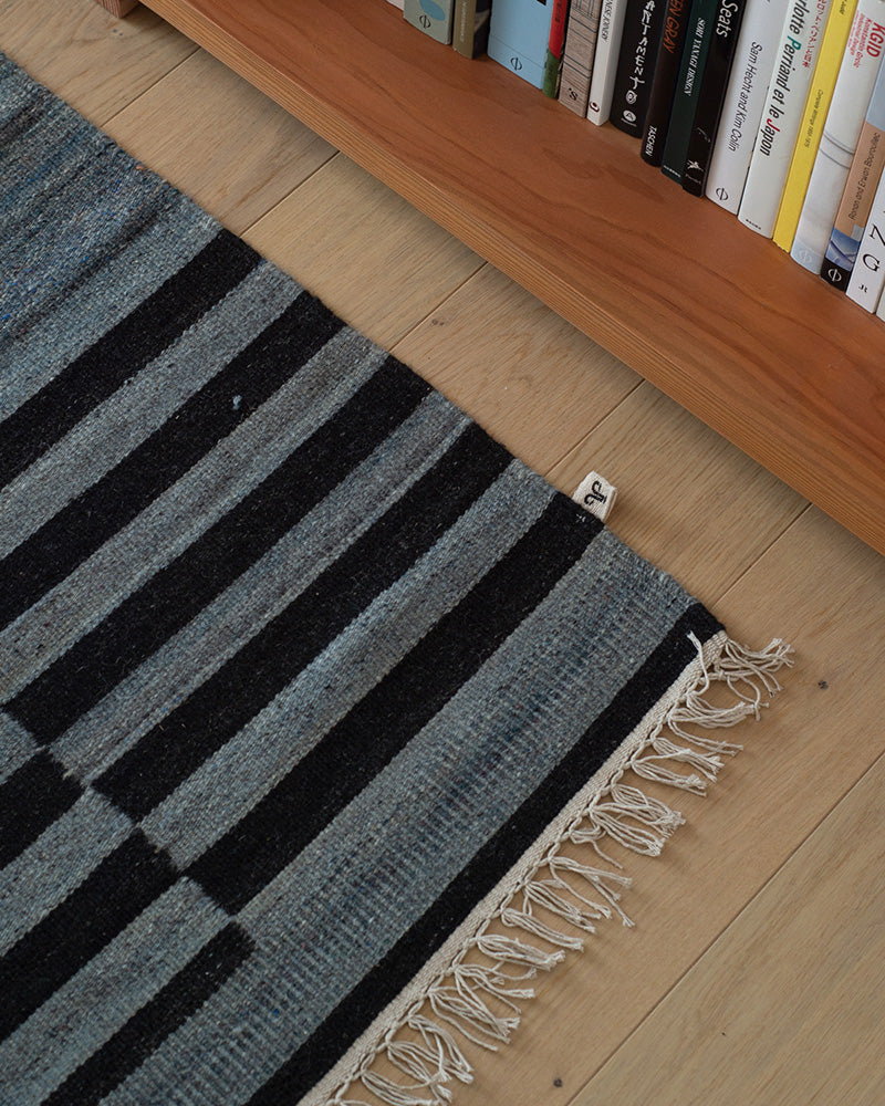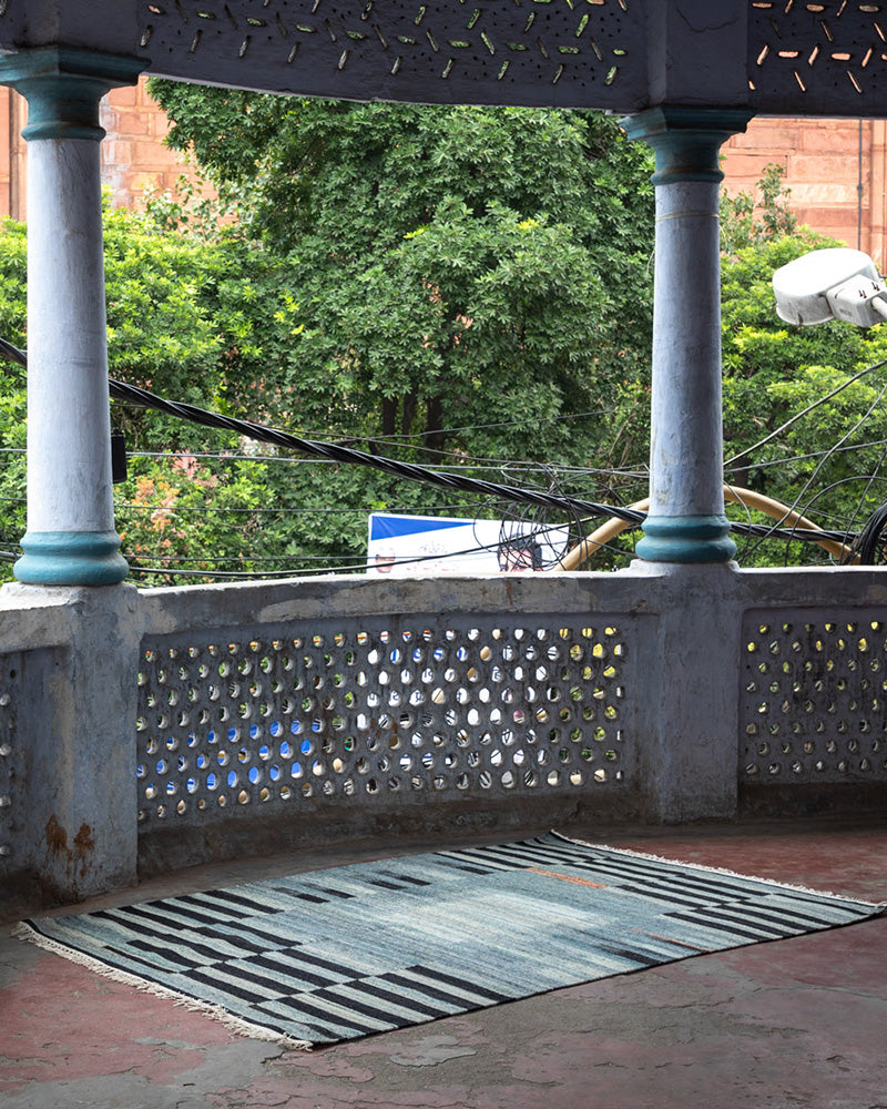 This rug was hand-woven in India before finding its way to your floor. Its tight kilim rug weave makes it ideal for high traffic areas like your living room, dinner table, foot of the bed, under the bed, and entry-ways. Blue and black stripe rug design.