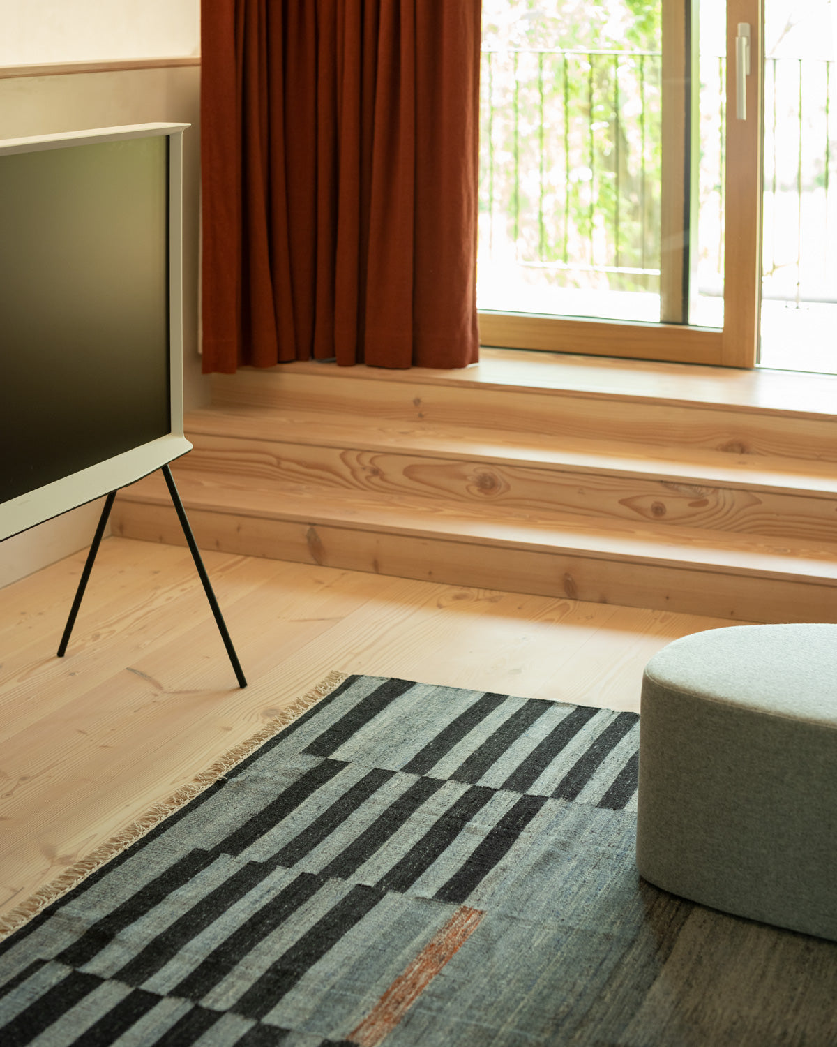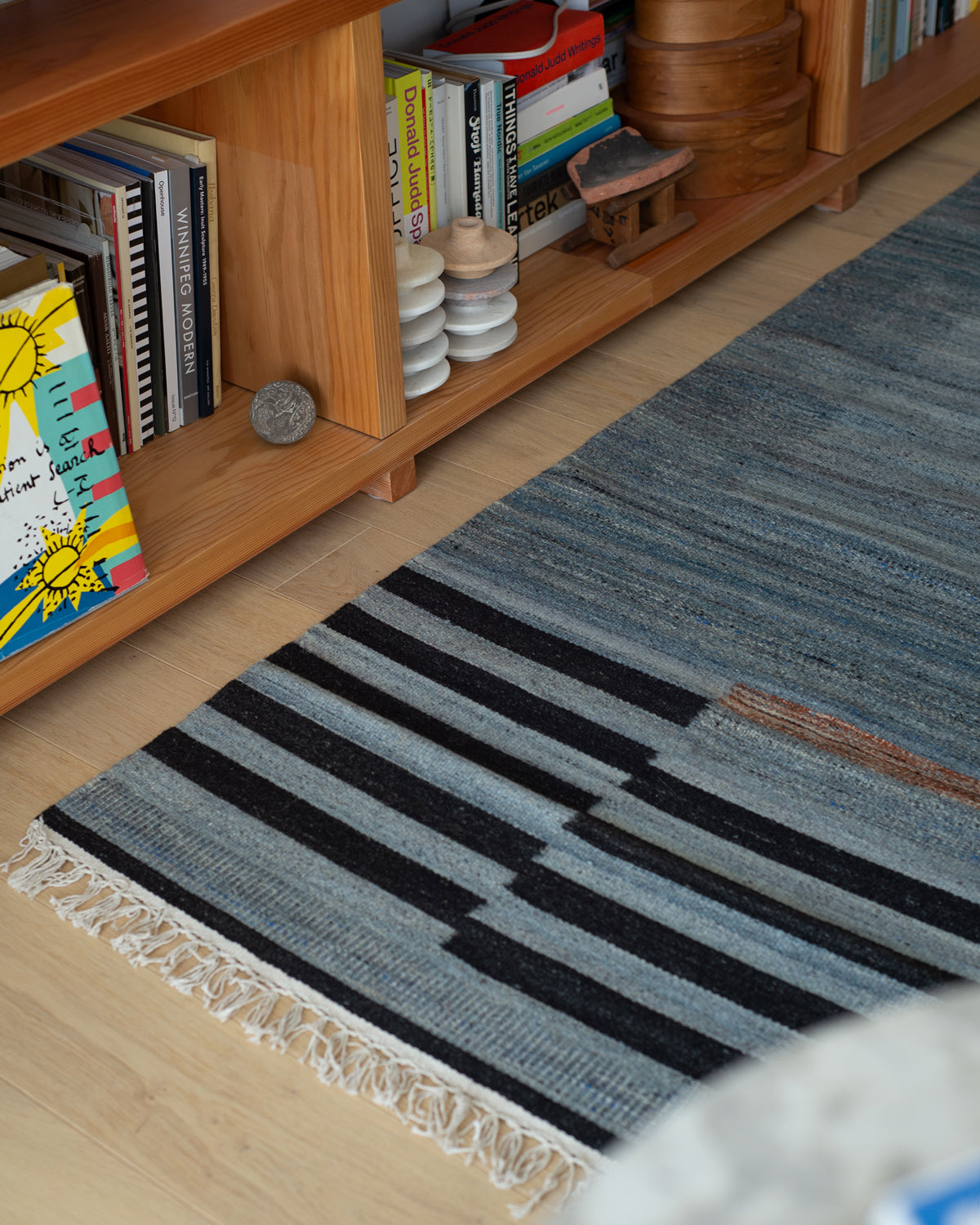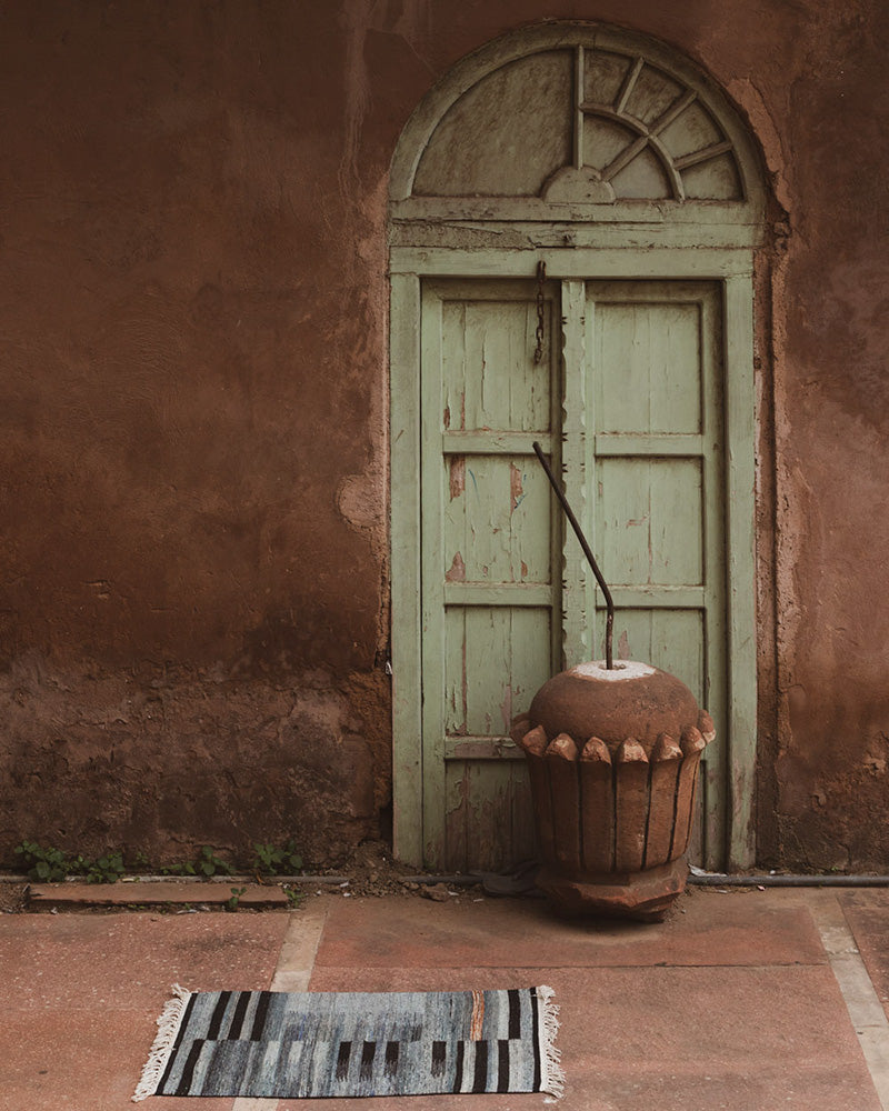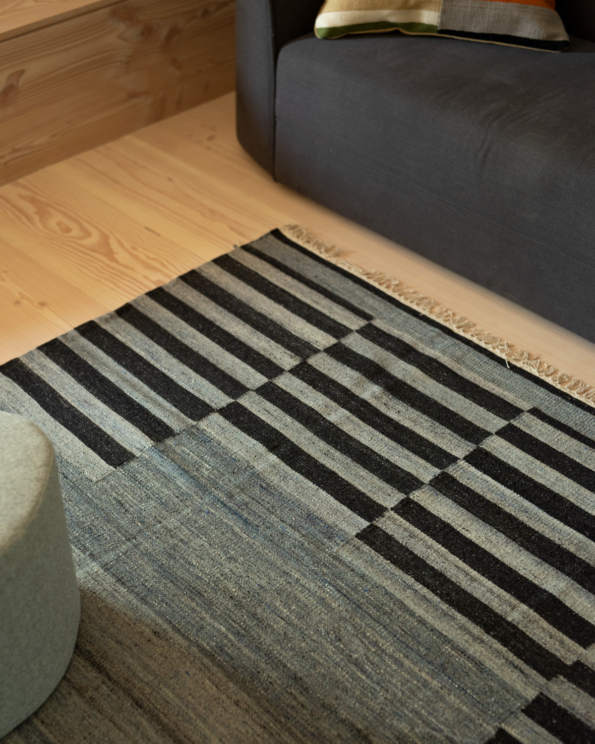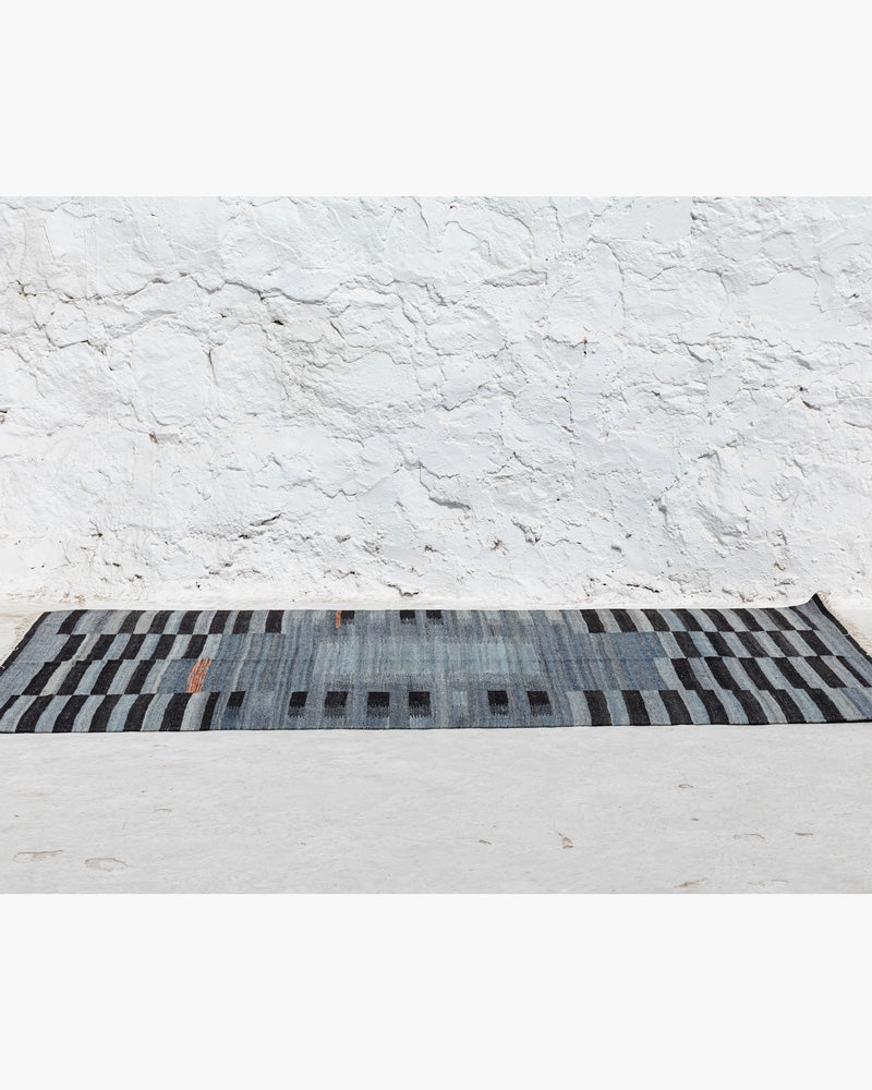 This rug was hand-woven in India before finding its way to your floor. Its tight kilim rug weave makes it ideal for high traffic areas like your living room, dinner table, foot of the bed, under the bed, and entry-ways. Blue and black stripe rug design.