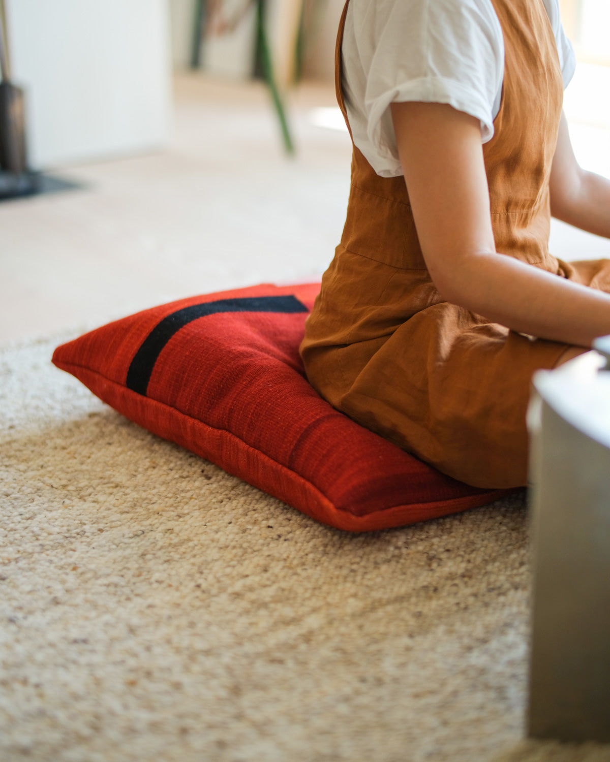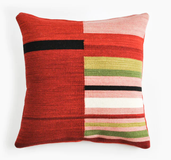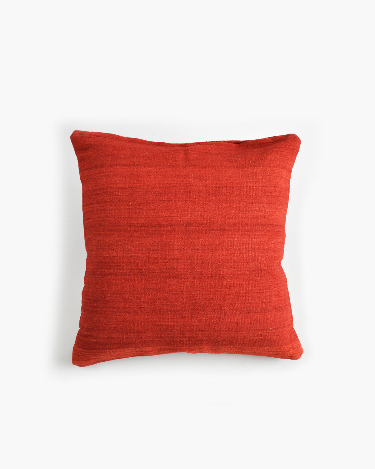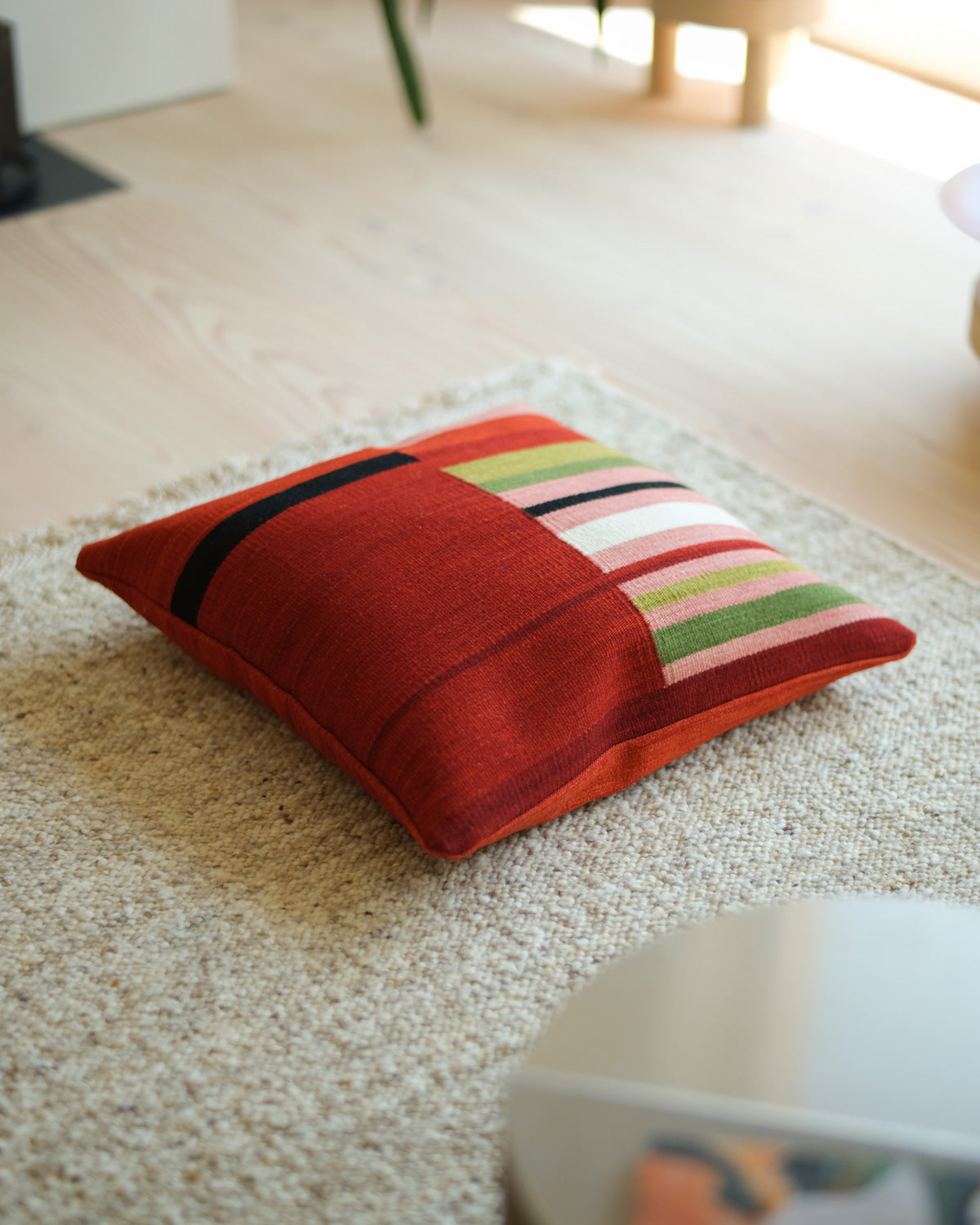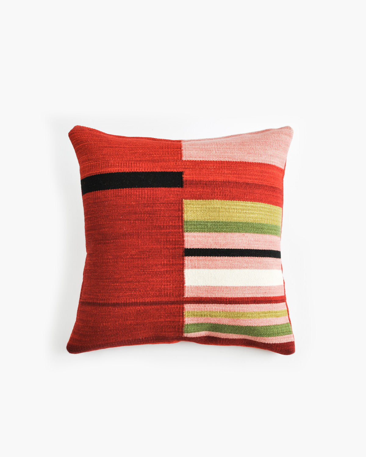 The ROSE GARDEN pillow cover is a flatweave kilim made on a hand loom. The underside of the pillow is made of cotton canvas with coconut buttons.