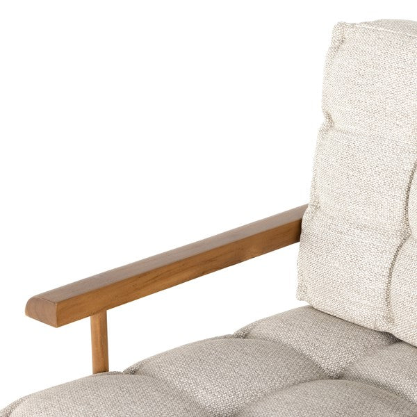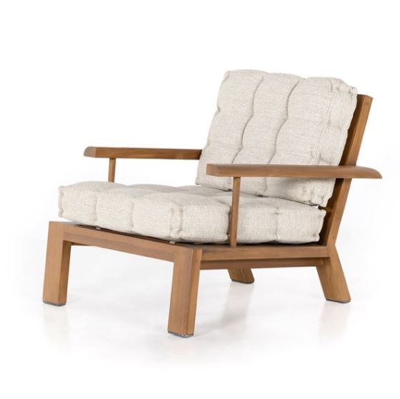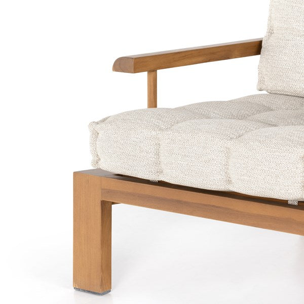 Cushy comfort, made for the outdoors. Wide framing of FSC-certified teak features paddle legs and a slatted back, with dramatically tufted sand-colored cushioning for a relaxed sit. Cover or store indoors during inclement weather and when not in use.