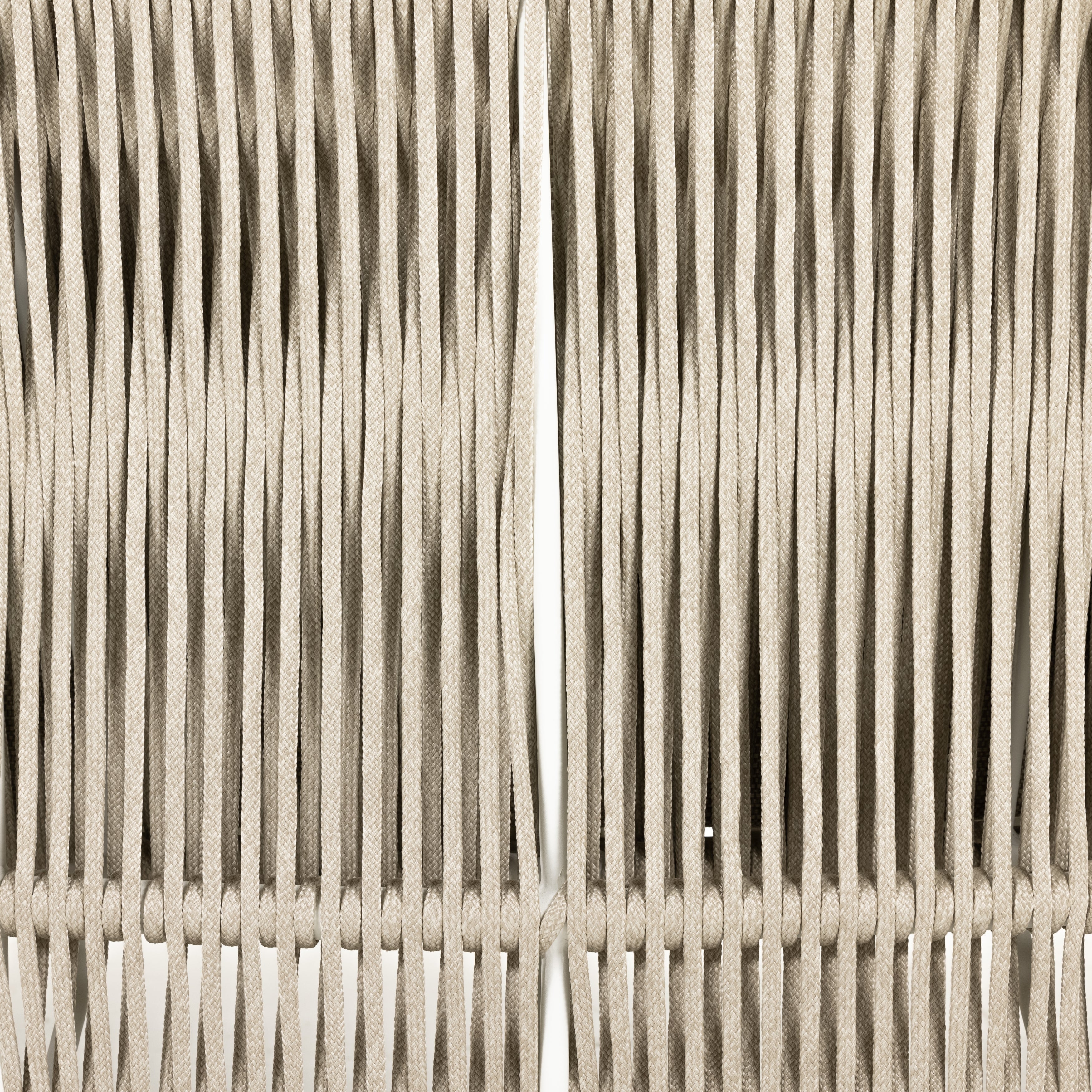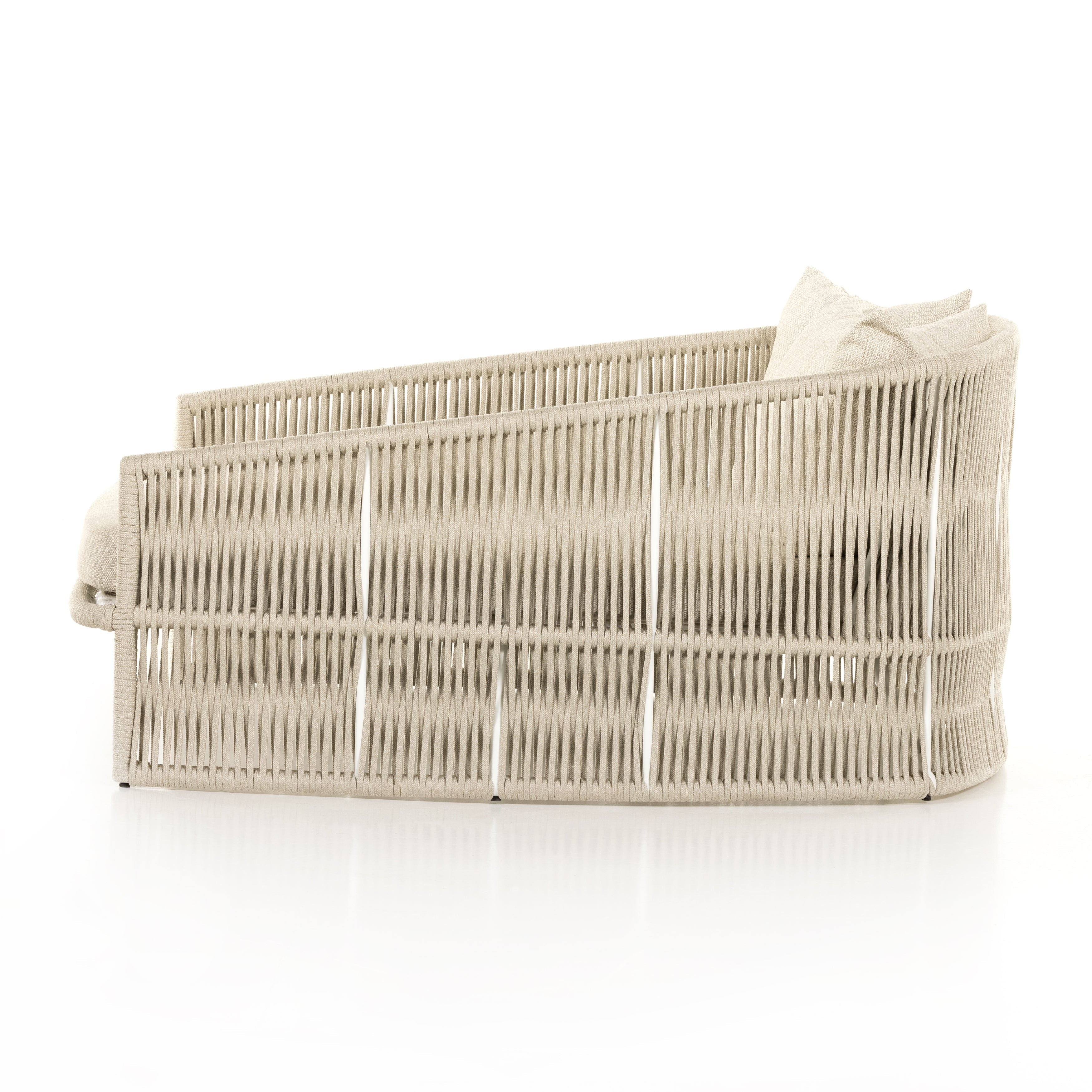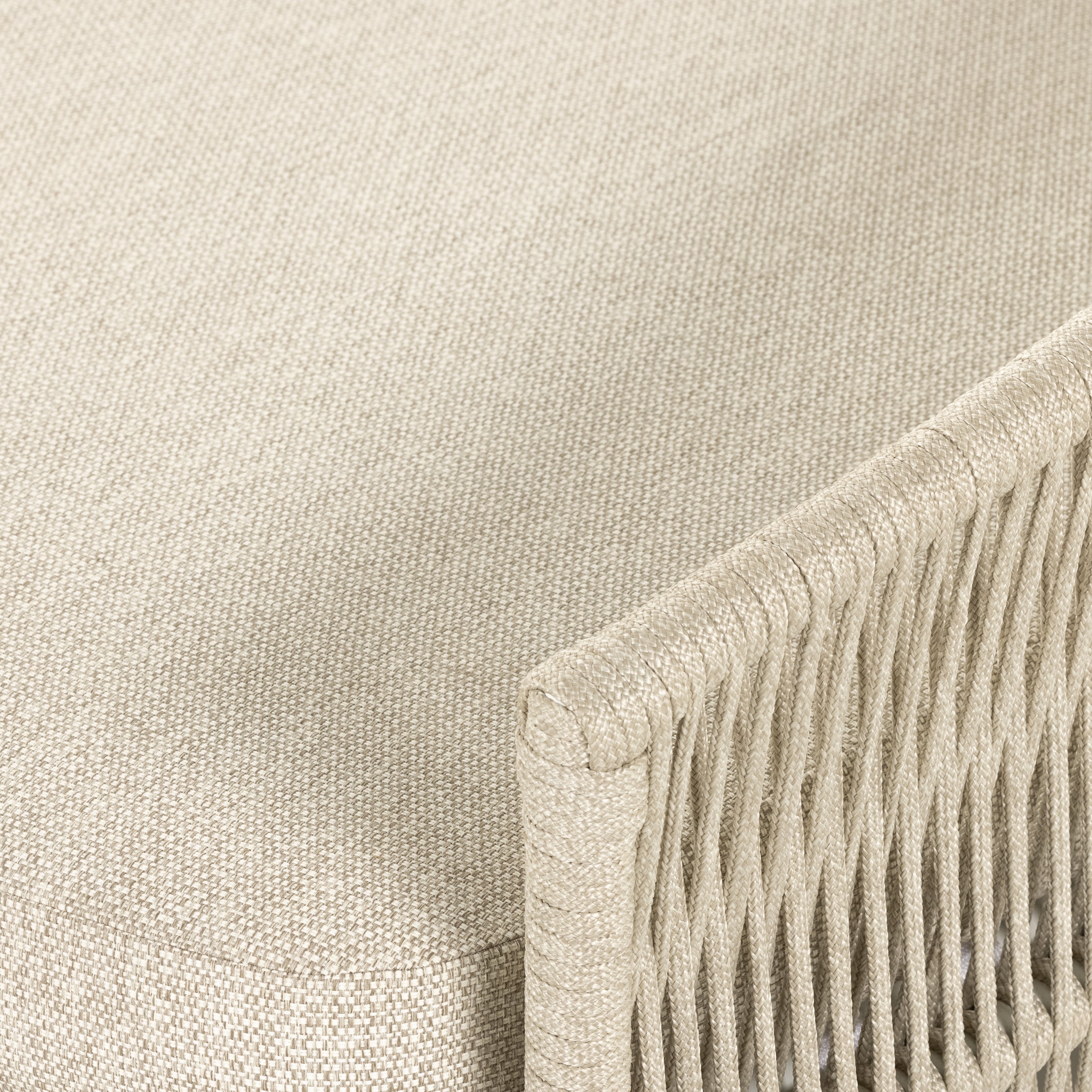 The perfect place for outdoor daydreaming. A beautiful rope-based design is woven across a durable aluminum frame in crisp white. Topped with a wide cushion and throw pillows, all upholstered in 100% Olefin, known for its UV-resistant, water-repellent and quick-drying abilities. Cover or store inside during inclement weather and when not in use.