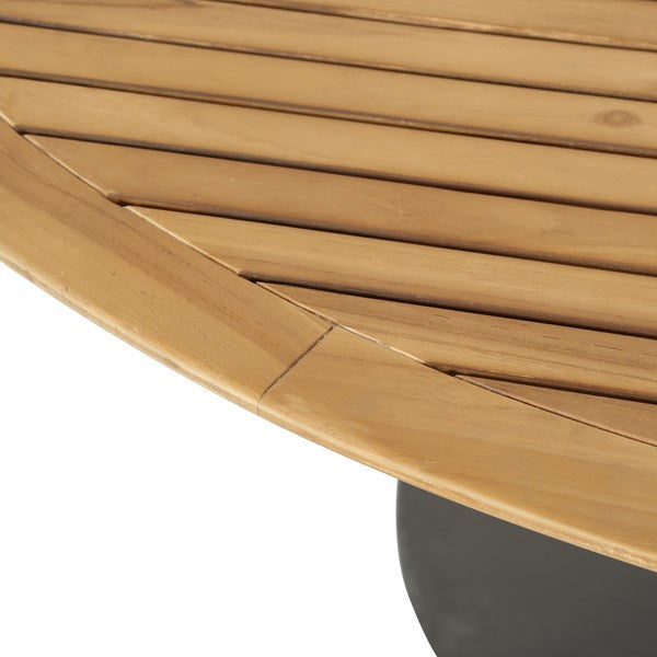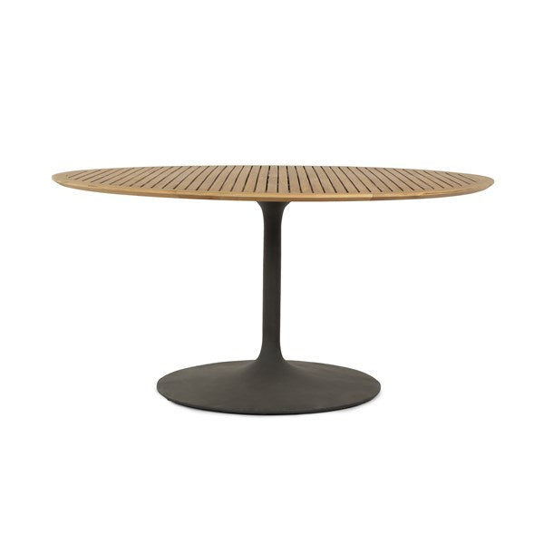 Natural FSC-certified teak forms a spacious slatted frame atop a tulip-inspired aluminum base finished in a warm bronze. Cover or store inside during inclement weather and when not in use.