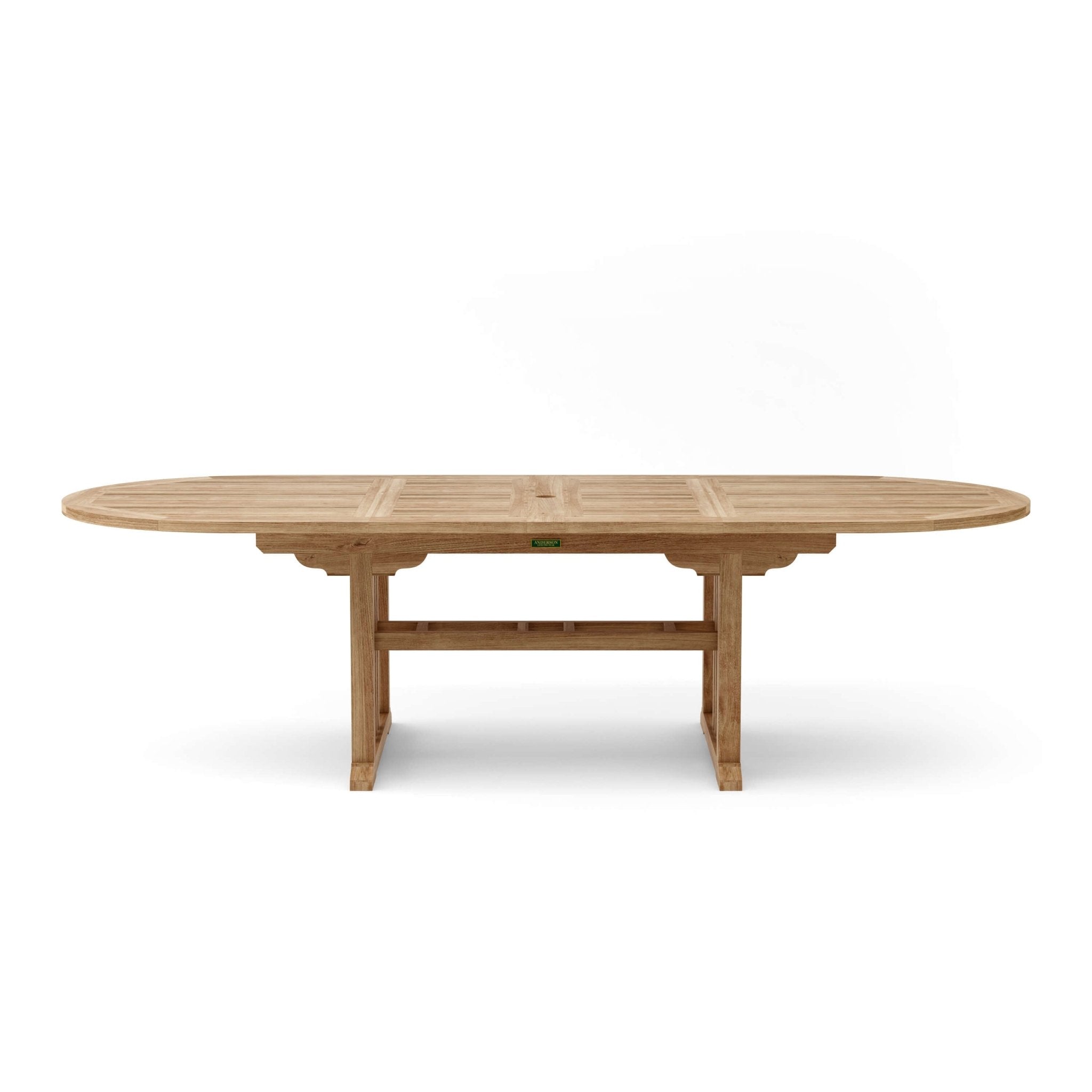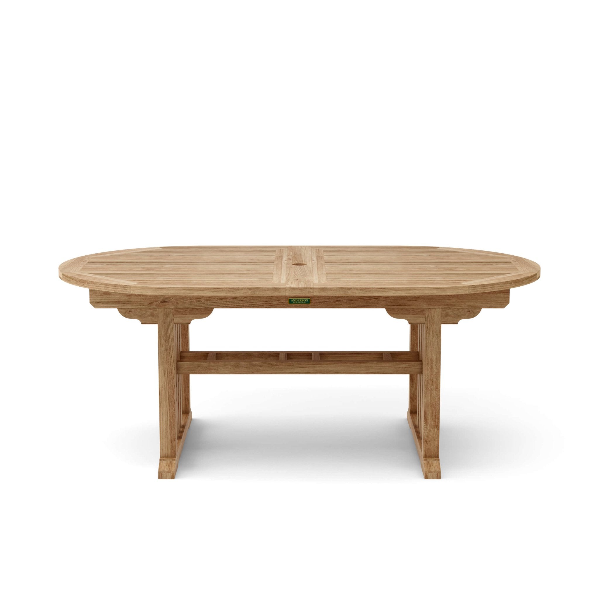 This solid teak “Sahara Oval Double Extension Table” makes the perfect addition to your patio or yard. The unique built-in butterfly pop-up leaf enables you to open and close your table in less than 15 seconds. The leaf folds away for easy storage under the table when not in use. The table stands 29? high and is 43? wide by 74? long, reaching up to 106? in length when fully extended. The table can be extended with 1 or 2 leaves, depending on the length you choose and seats 10 to 12 people comfortably. Includes umbrella hole in center with brass plug when not in use.