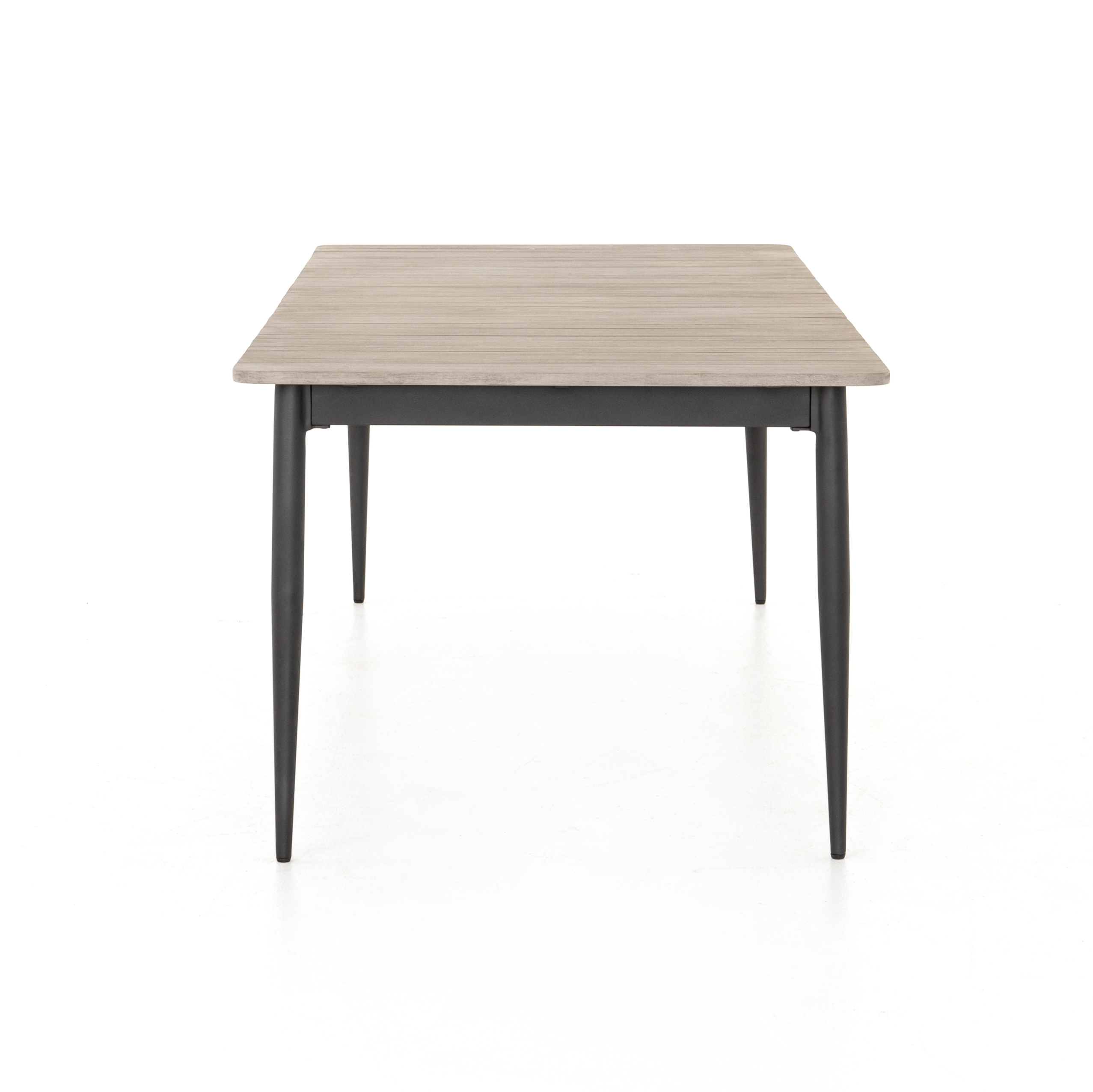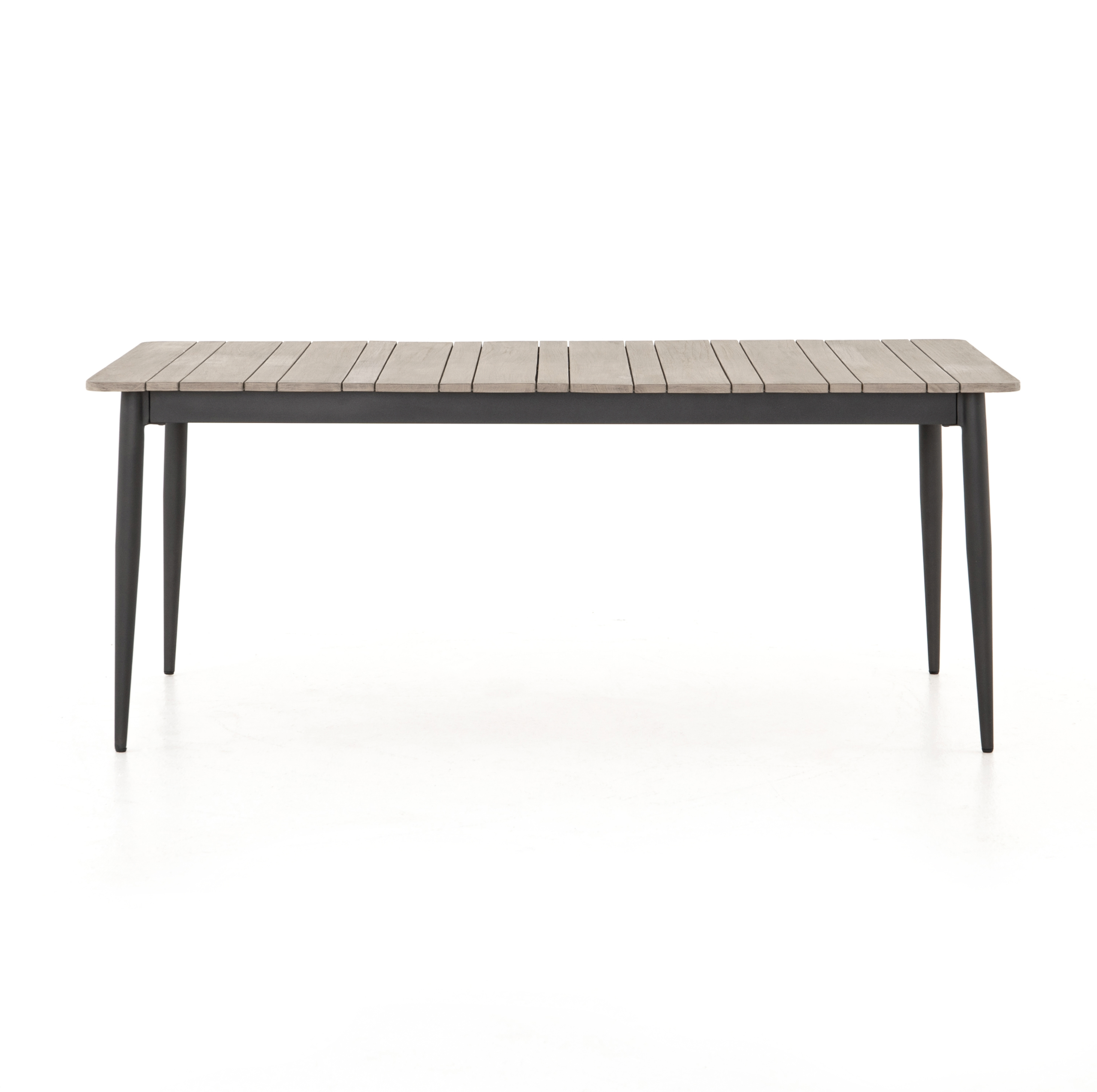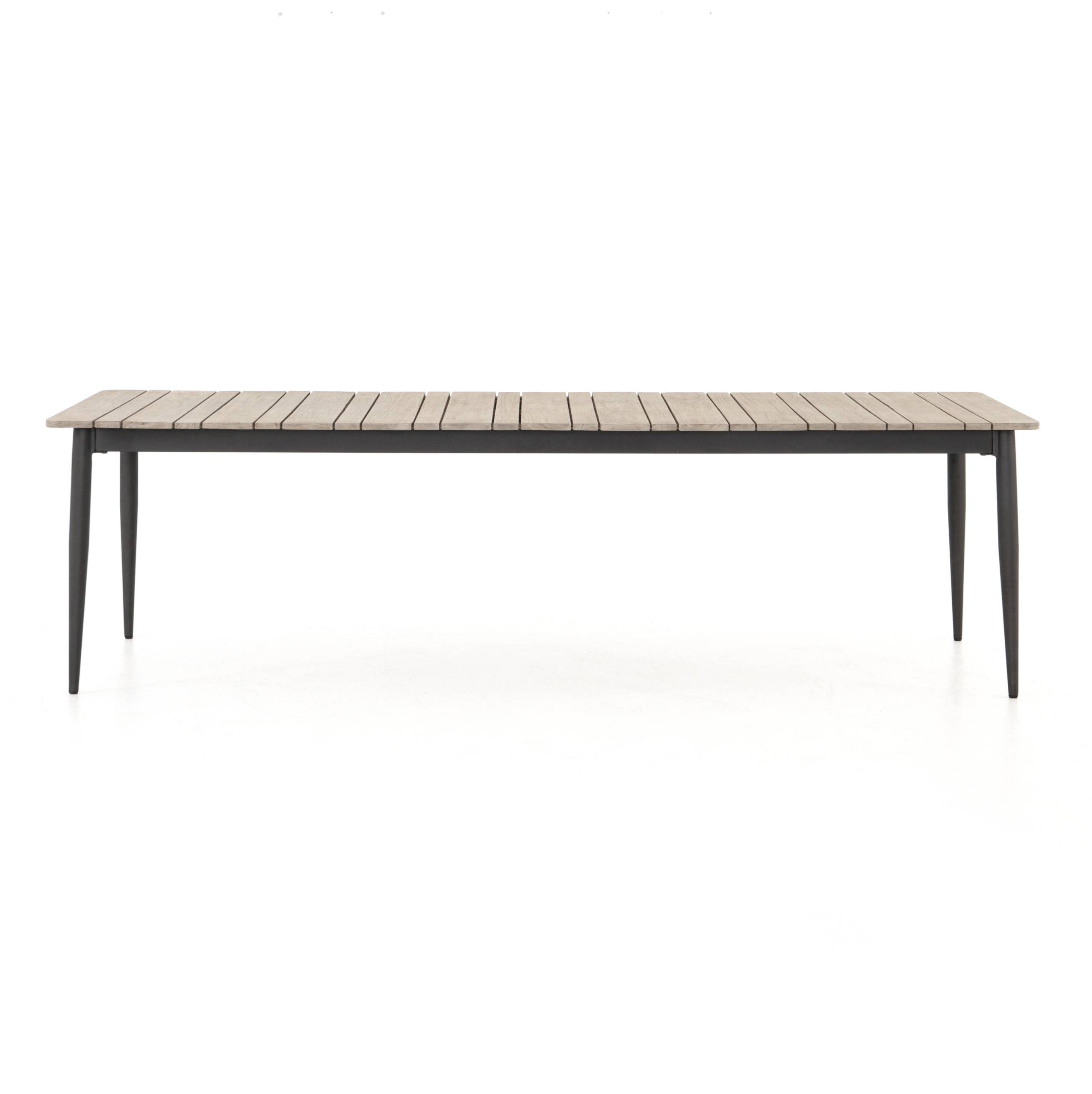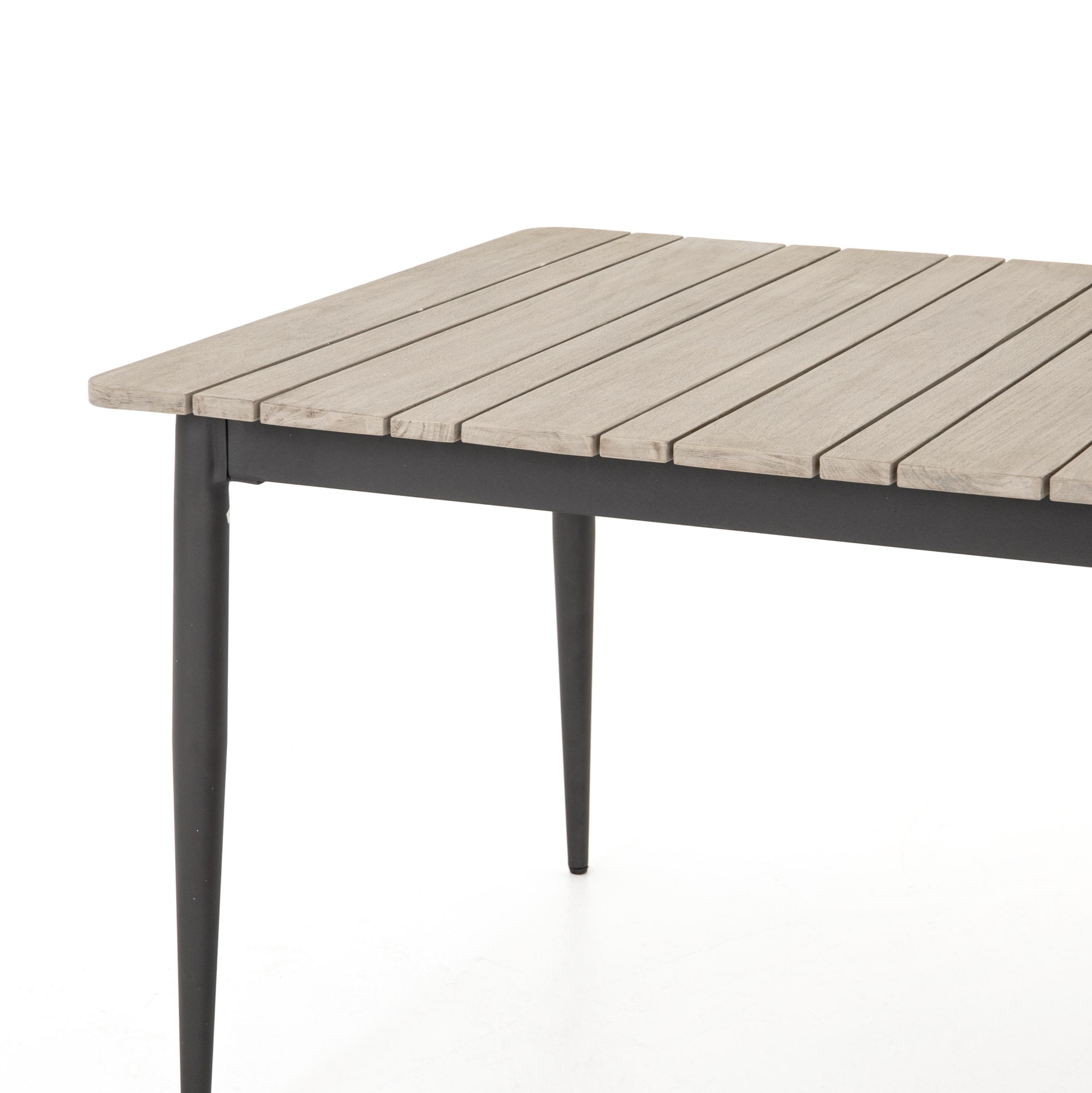 High style, indoors or out. Teak wood is fashioned into a slatted dining table and finished in a washed brown, with slim, bronze-finished aluminum legs for a modern touch. Cover or store indoors during inclement weather and when not in use.