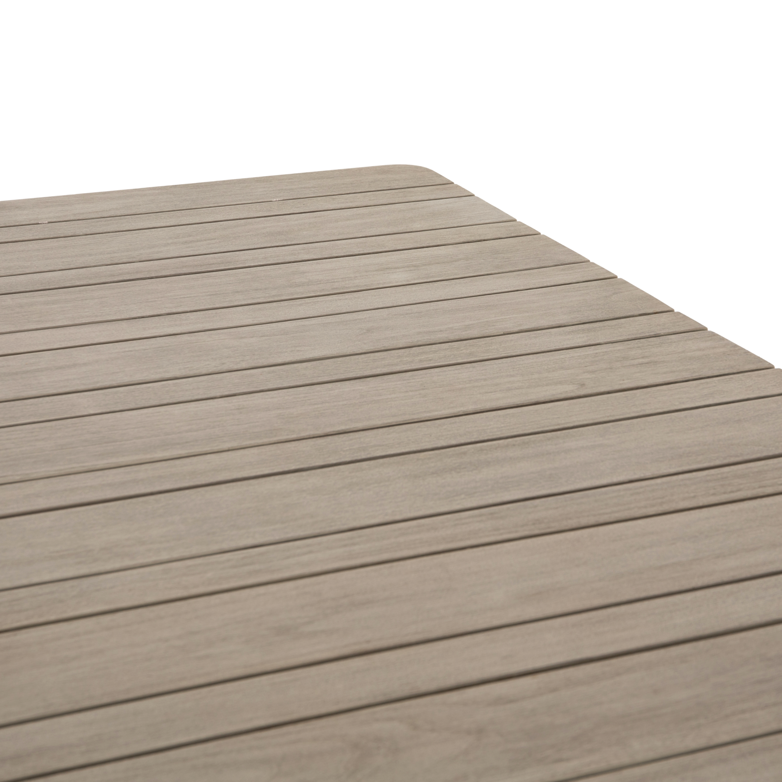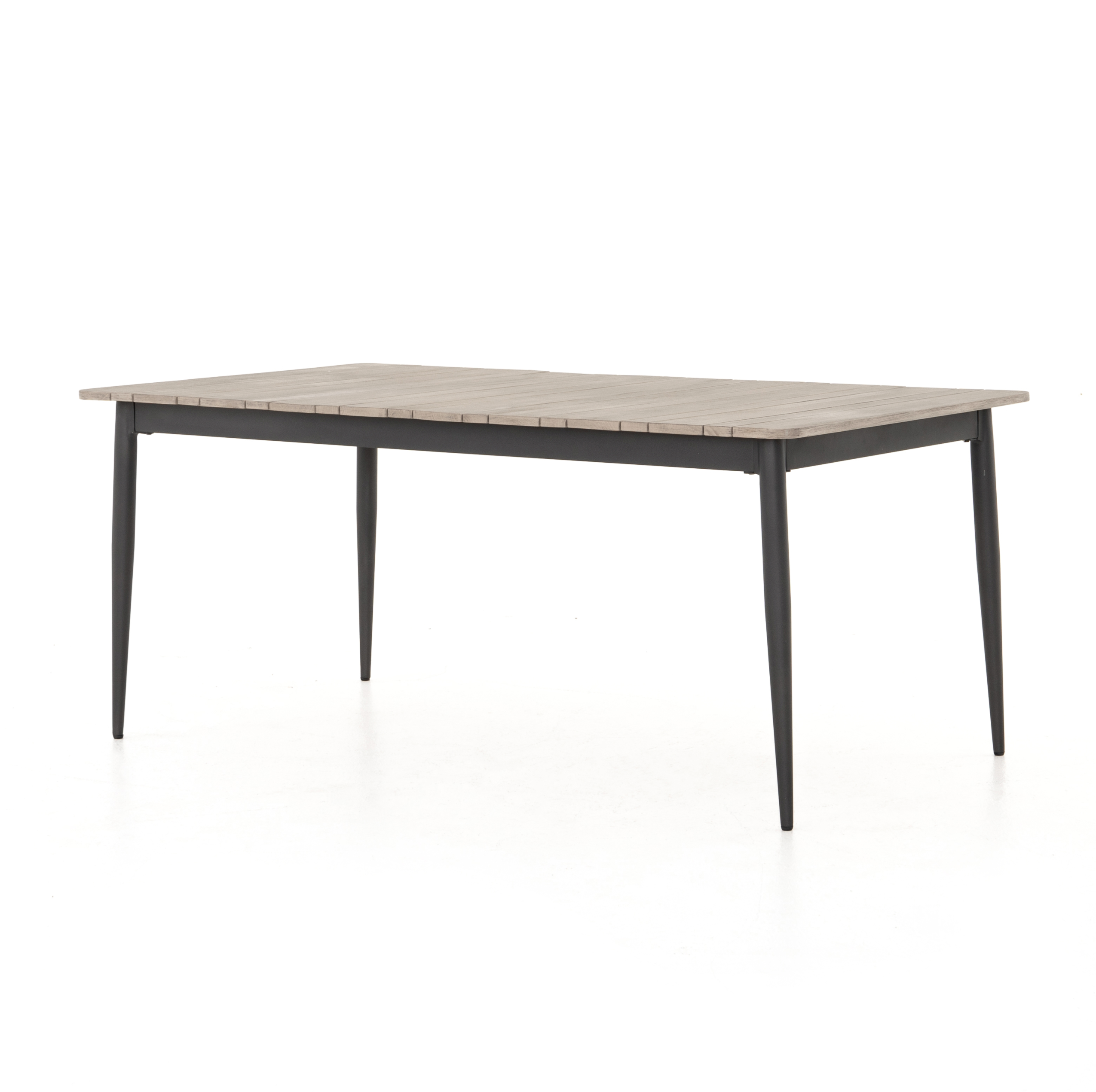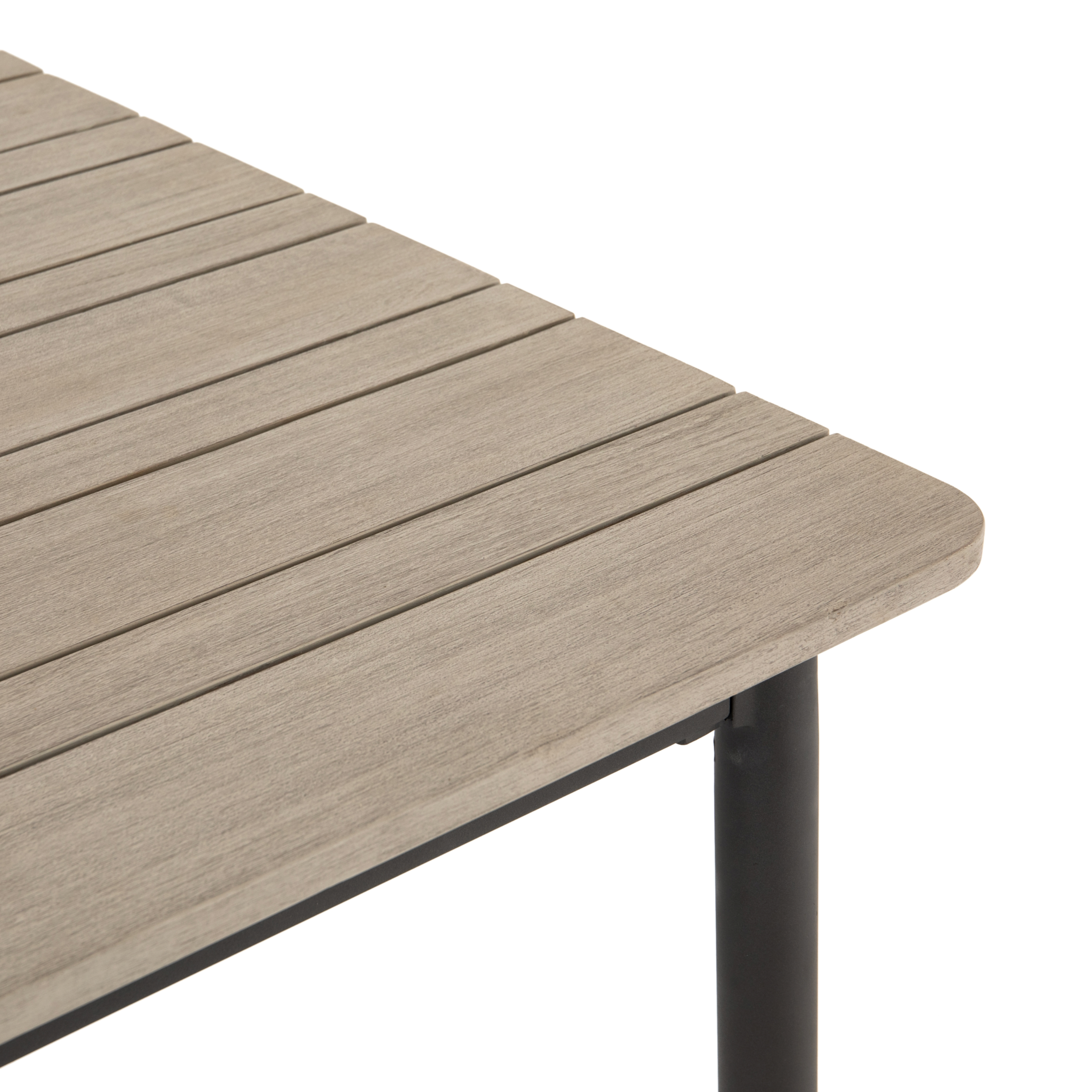High style, indoors or out. Teak wood is fashioned into a slatted dining table and finished in a washed brown, with slim, bronze-finished aluminum legs for a modern touch. Cover or store indoors during inclement weather and when not in use.