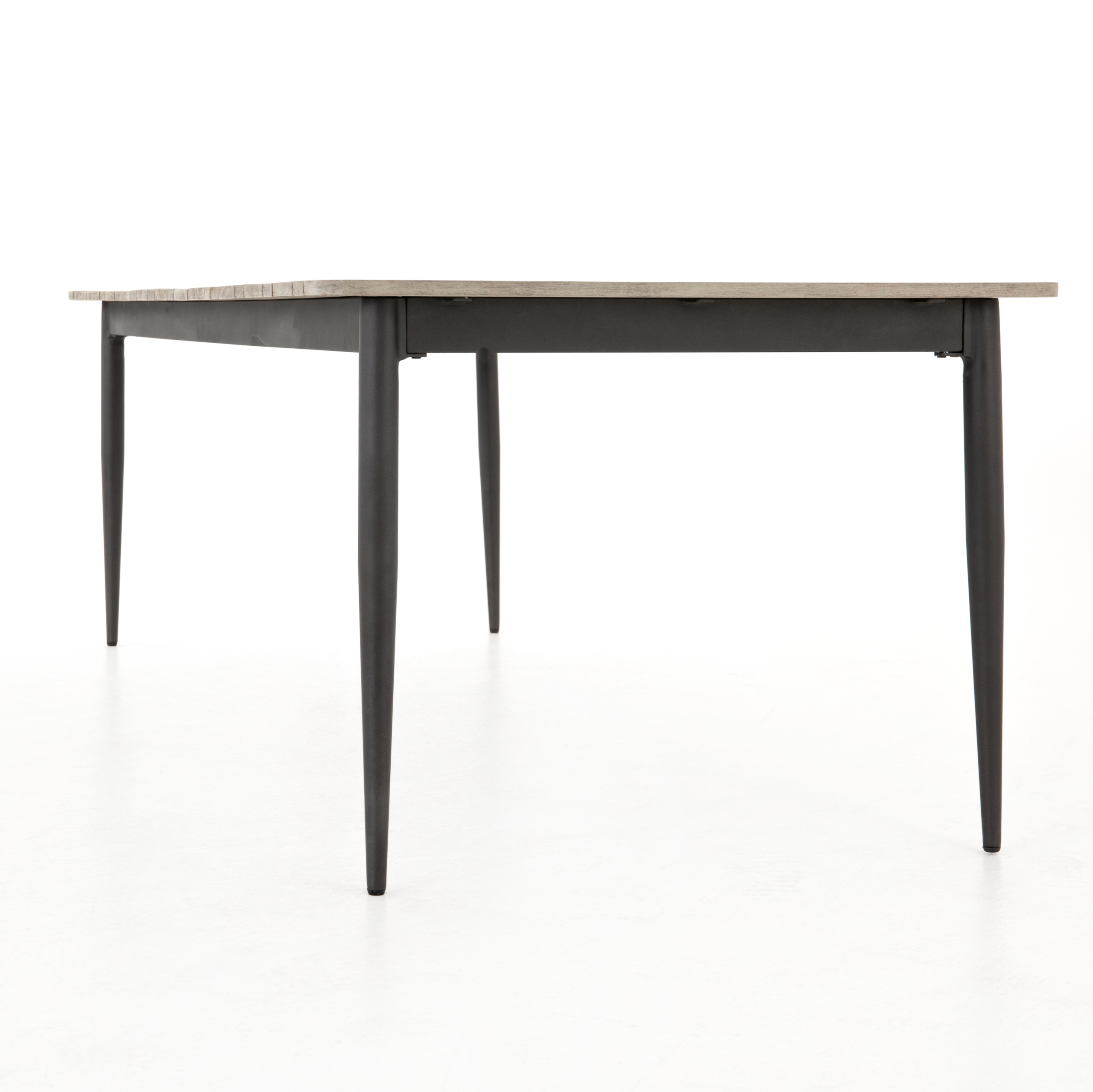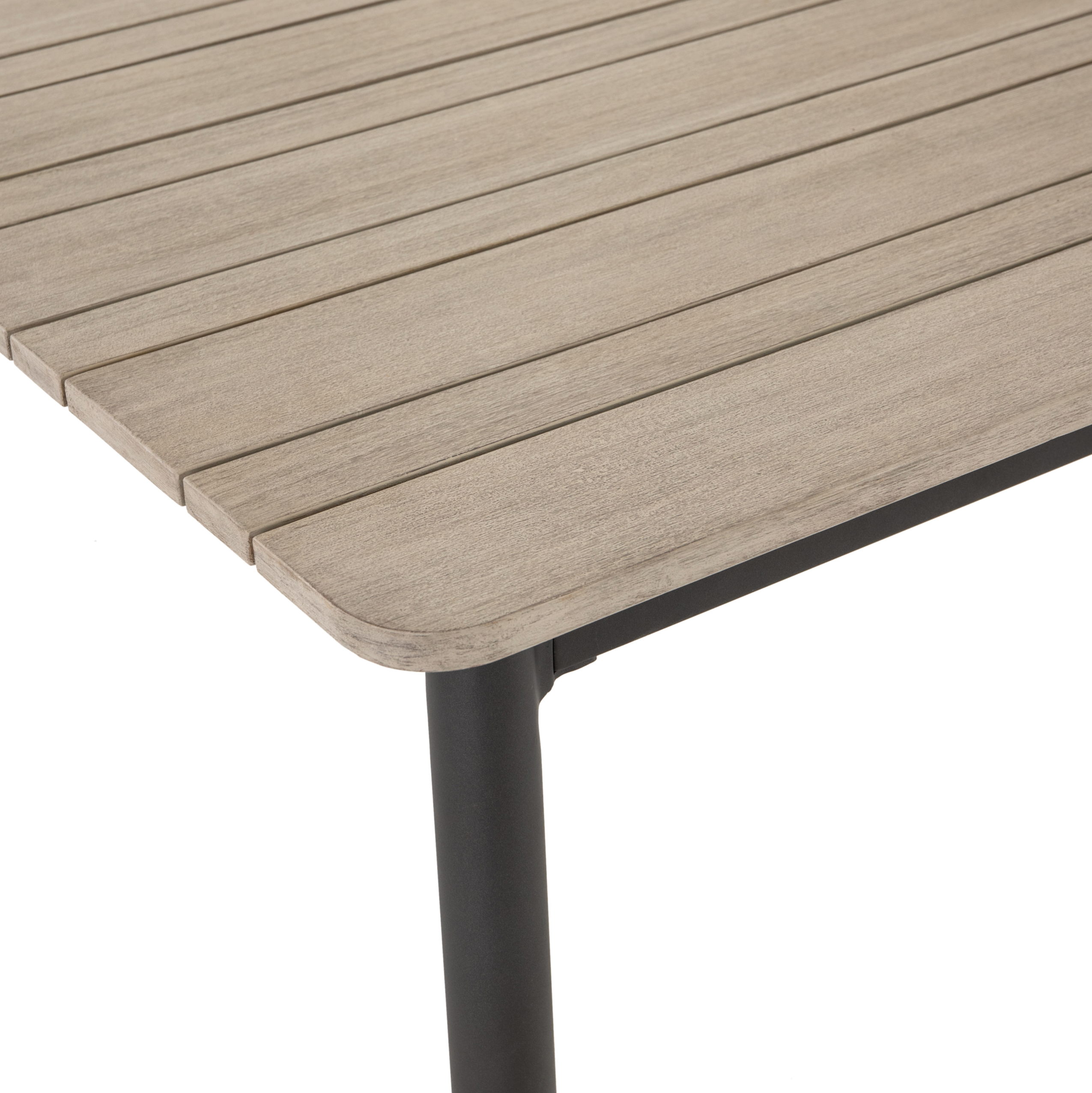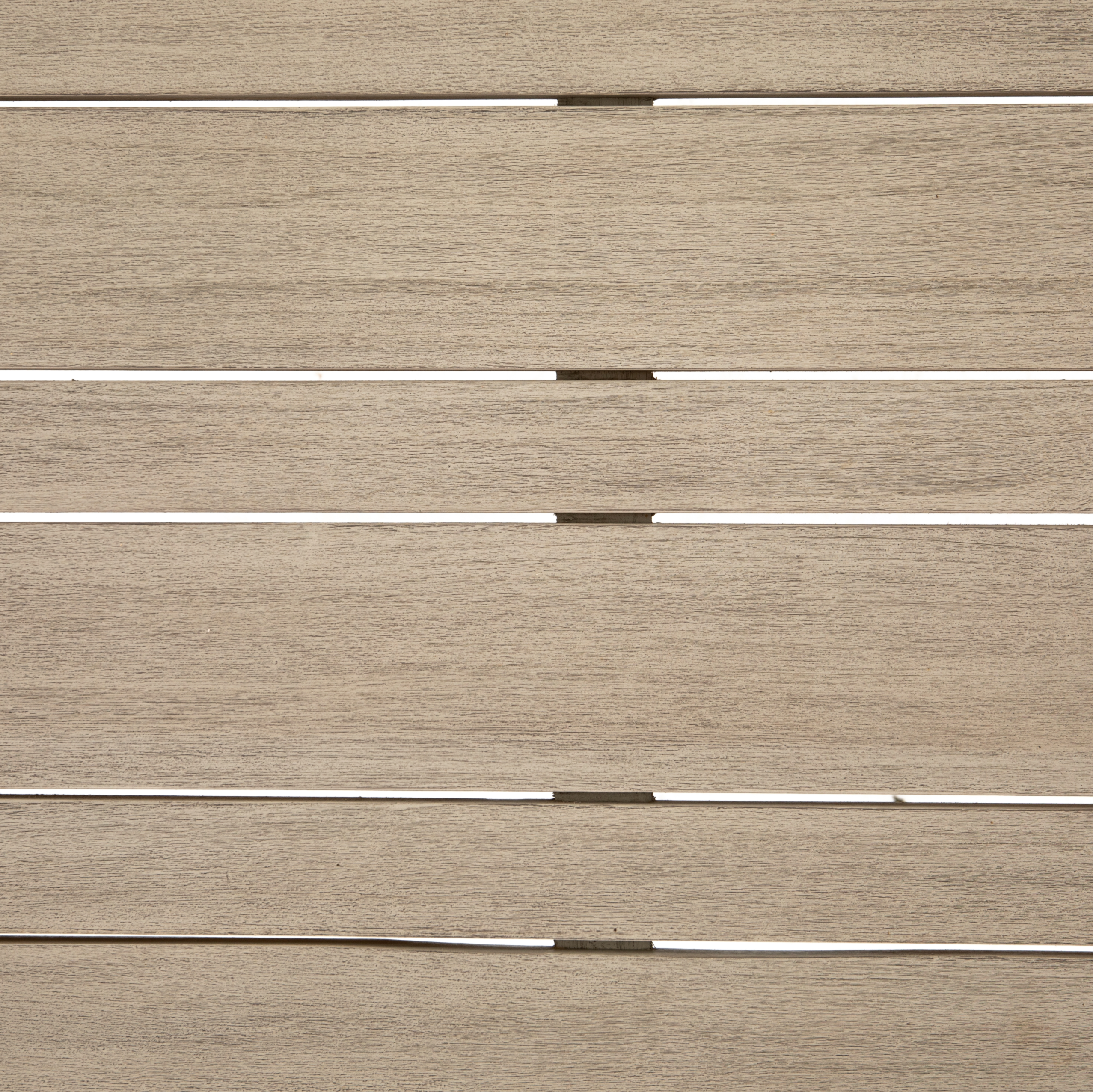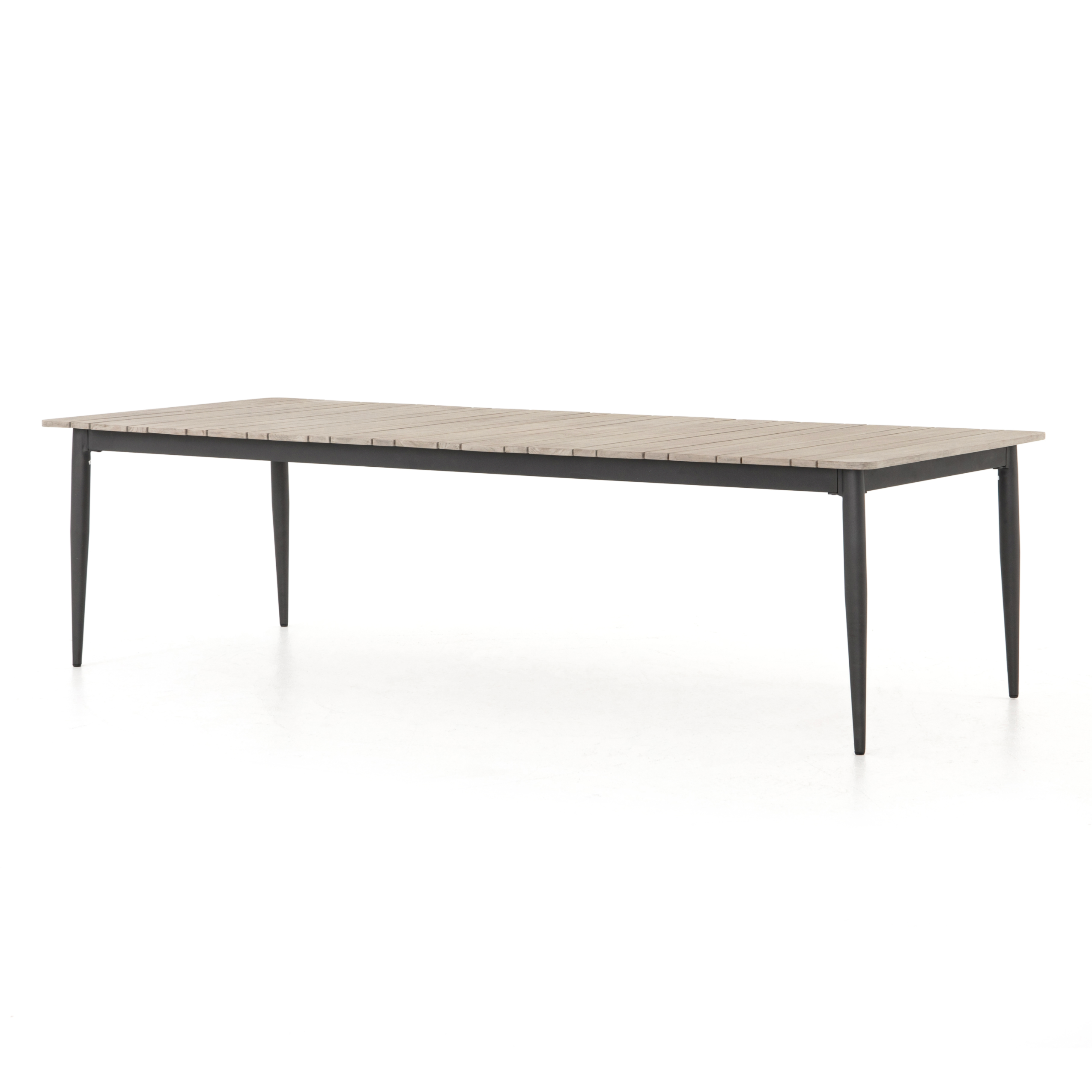 High style, indoors or out. Teak wood is fashioned into a slatted dining table and finished in a washed brown, with slim, bronze-finished aluminum legs for a modern touch. Cover or store indoors during inclement weather and when not in use.