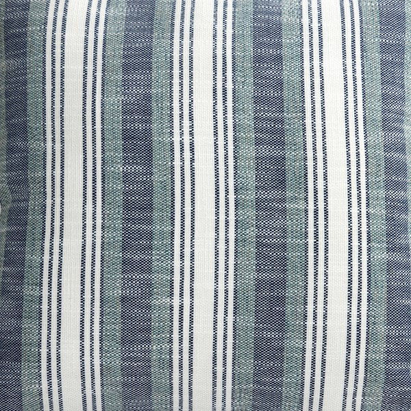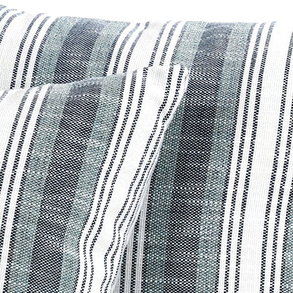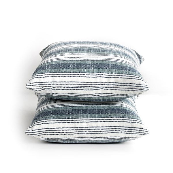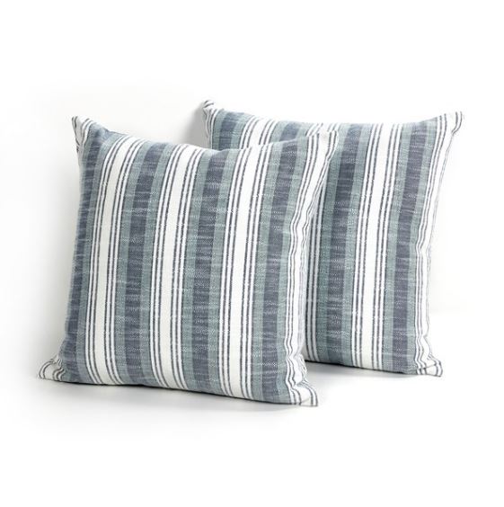 Add a stylish finishing touch to outdoor seating with a two-pillow set of linen-like throw pillows, featuring a stripe pattern in a range of complementary aqua hues. Cover or store indoors during inclement weather and when not in use.