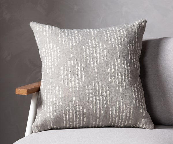 Bring an abstract touch to outdoor styling. This set of double-sided throw pillows features an embroidered diamond pattern in a versatile white on grey, with poly fill and a bottom zipper for seamless ease. Store indoors during inclement weather and when not in use.