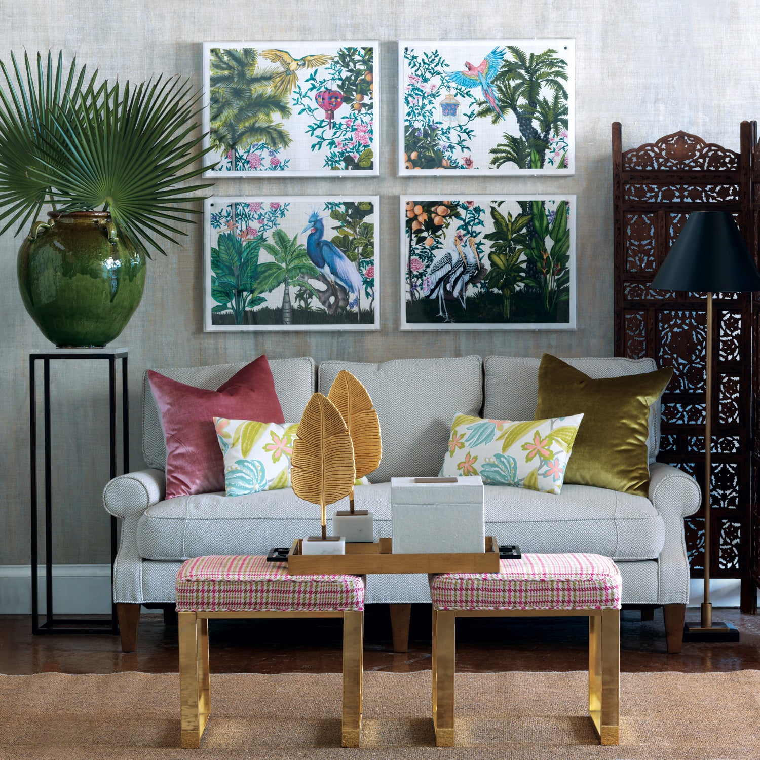 Whimsical and colorful tropical panels, our artwork collection features a giclee print mounted under a 2.5 deep lucite shadow box. Attached to a linen wrapped interior panel, the artwork is finished with black nailhead in each corner. Each panel is sold individually. Artwork may be hung as a scenic left/right pair, or grouped as a family of four. Paradise I-IV makes a dramatic statement as a grand wall panel. ACJS-312-10. Paradise I. ACJS-312-11. Paradise II. ACJS-312-12. Paradise III. ACJS-312-13. Paradise IV.