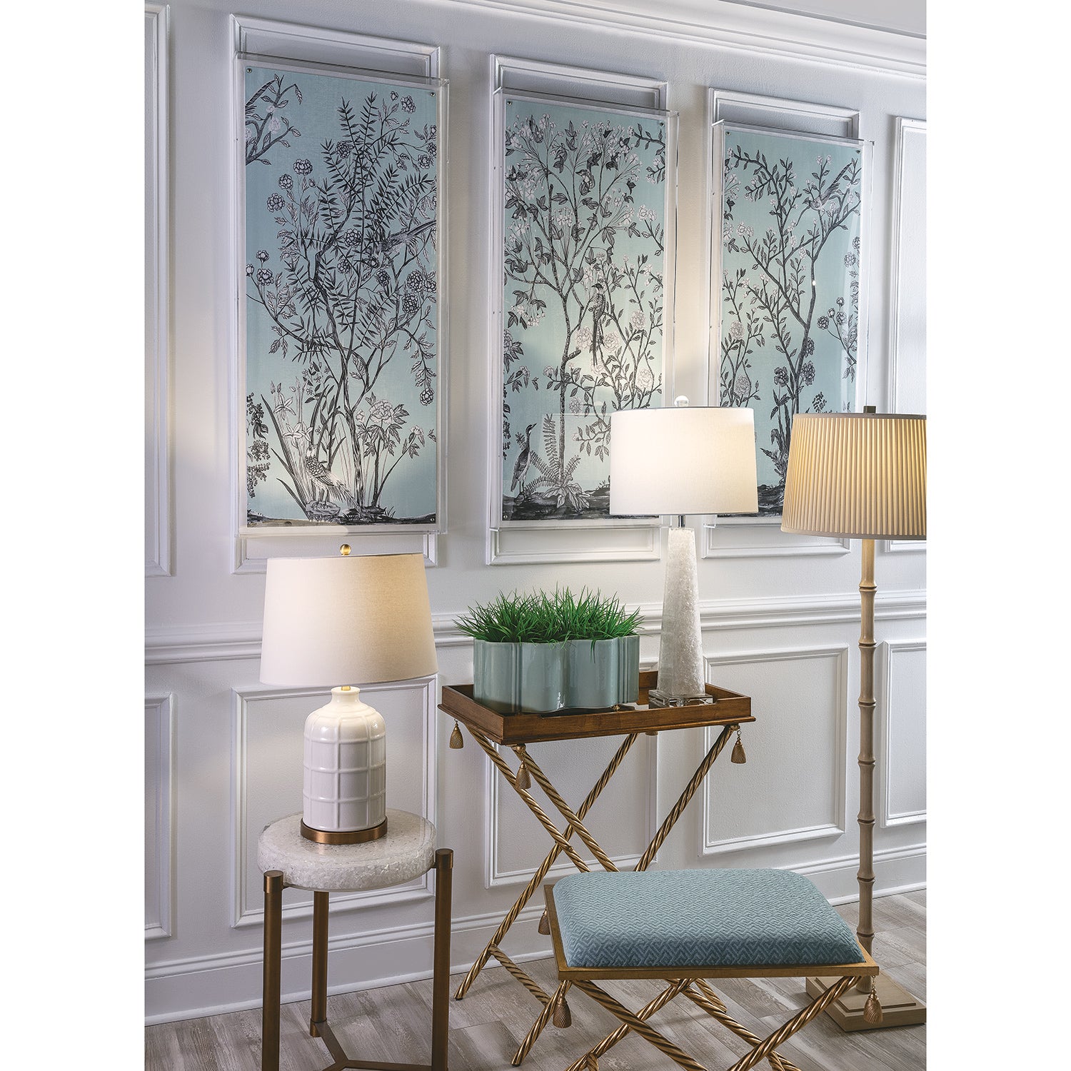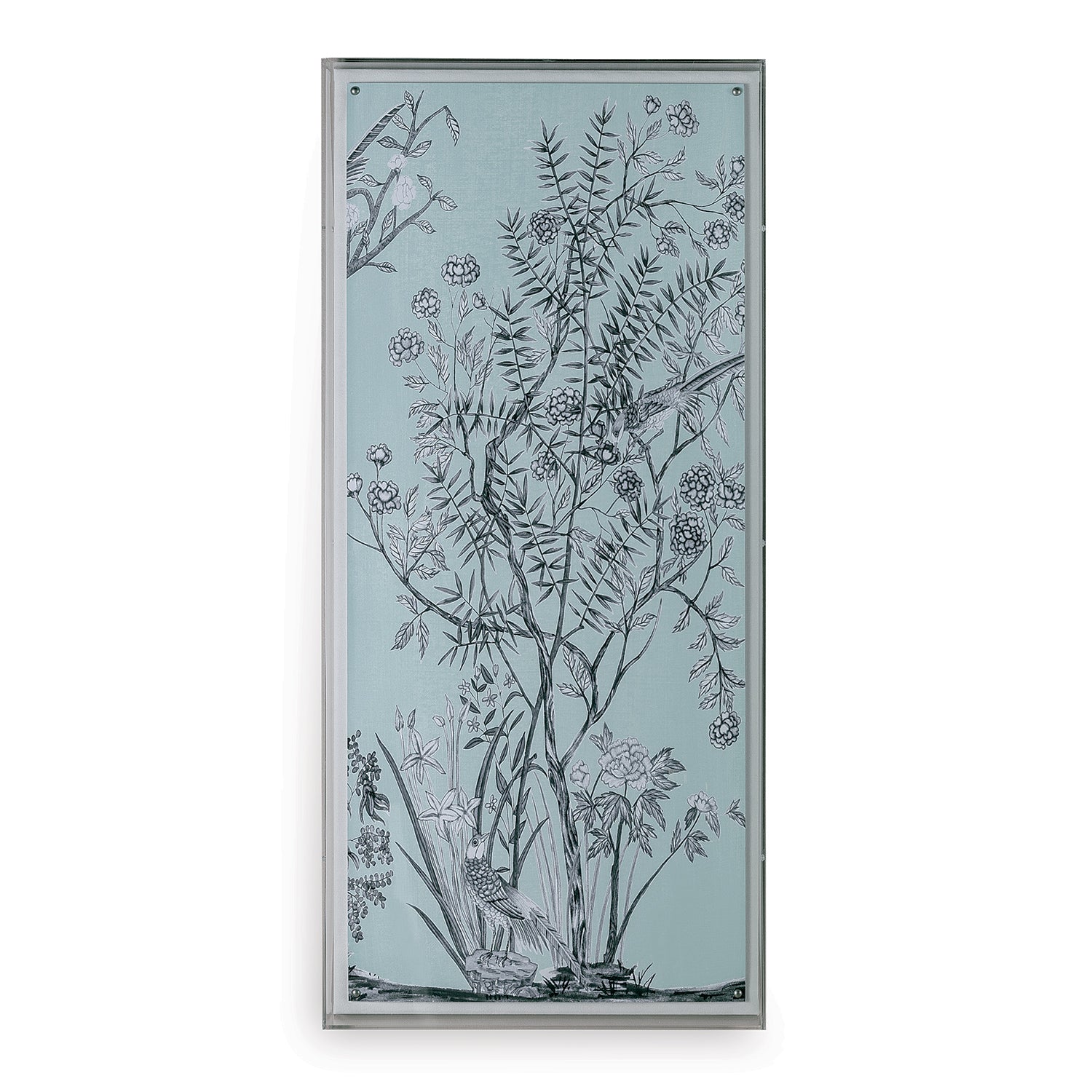 The Tree of Life is painted in the glorious chinoiserie style. The colors of celadon and subtle sepia tones in gray depict a scenic tableau of floral vines and plants in the countryside with birds chirping among the trees. The panels are individually sold, but ever so dramatic when shown as a triptych. Each panel is a giclee print mounted with an accent of nickel nailhead in each corner. Mounted under a acrylic shadow box frame, attached to an upholstered interior board covered in a cotton/linen fabric. Measurement: panels are 48H x 22W x 2.5D each. Materials: acrylic shadow box frame, interior board, paper Please Note: this panel artwork size is a truck shipping item. It does not qualify for ground shipping. Any questions on shipping, please reach out to customer service.