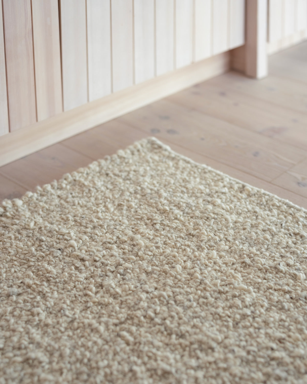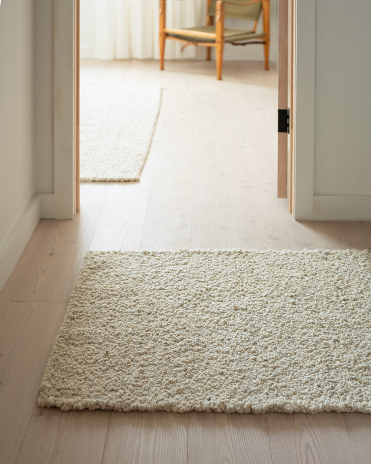 Hand Woven off white and silver wool area rug. This soft wool carpet was made by hand in Northern India. Hand woven New Zealand sheep's wool with Linen. Woven with a traditional hand loom. New Zealand wool rugs are durable and soft to the touch. High quality wool rugs.