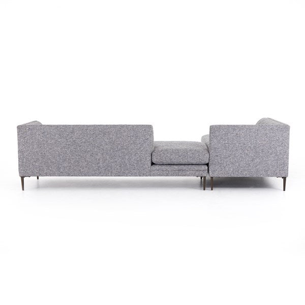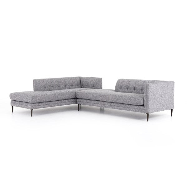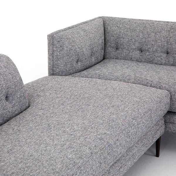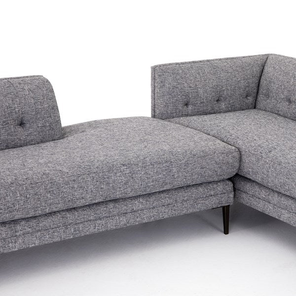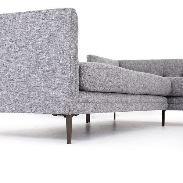 Upholstered in a modern slate tweed exclusive to Four Hands, a blend of boucle hues make for a textural, well-tailored sit with mid-century airs. Bench cushion and blind tufting, with simple steel legs finished in an aged bronze. Great on its own or paired with matching sectional as right arm facing chaise.