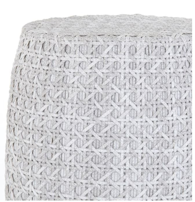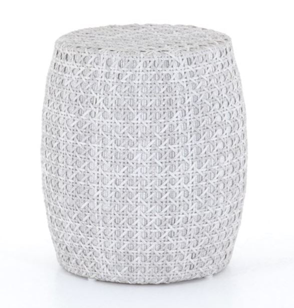 Bring a handy extra surface to outdoor entertaining. A beautifully simple drum table is woven for a look of rich texture and finished in a versatile white-grey. Cover or store indoors during inclement weather and when not in use.