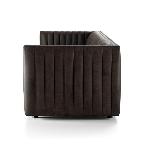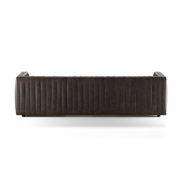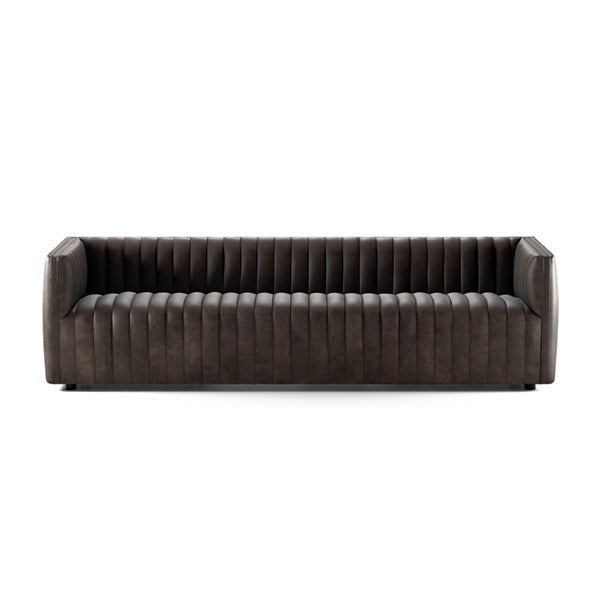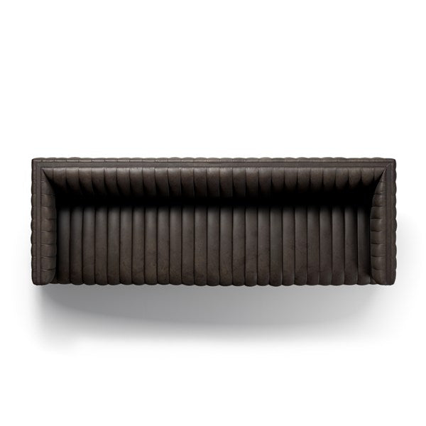 Luxurious top-grain leather seating takes on a deep brown hue with dramatic channeling, for trend-forward texture and sumptuous sit.