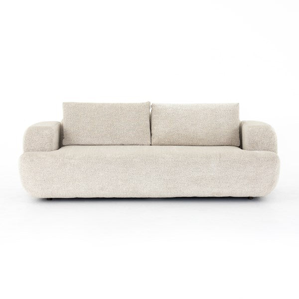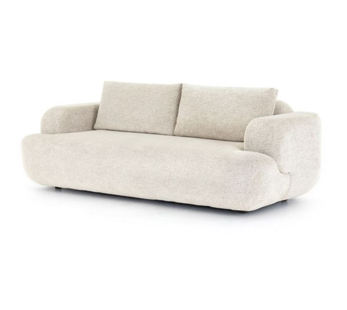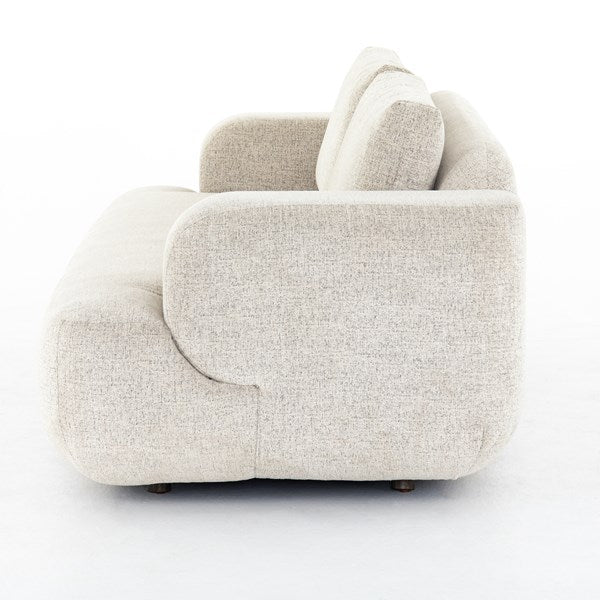 Pump up the volume. Sculptural, statement-making sofa seating meets shapely curves with fine tailoring. Plush chenille-like upholstery emits highs and lows for a refined look and textural feel with eye-catching highs and lows. Rounded edges and roomy seating space, plus pleated back cushions for comfort.