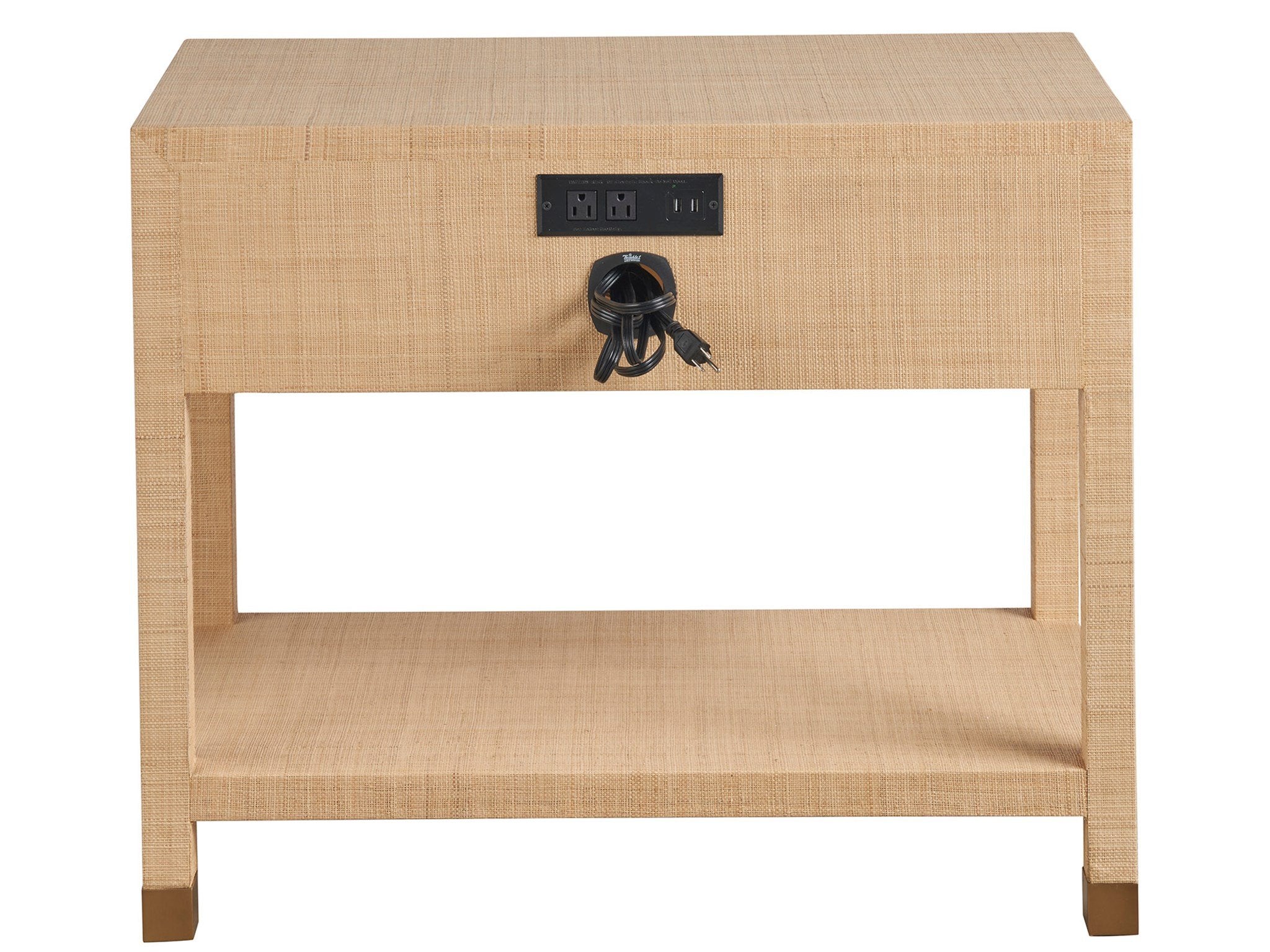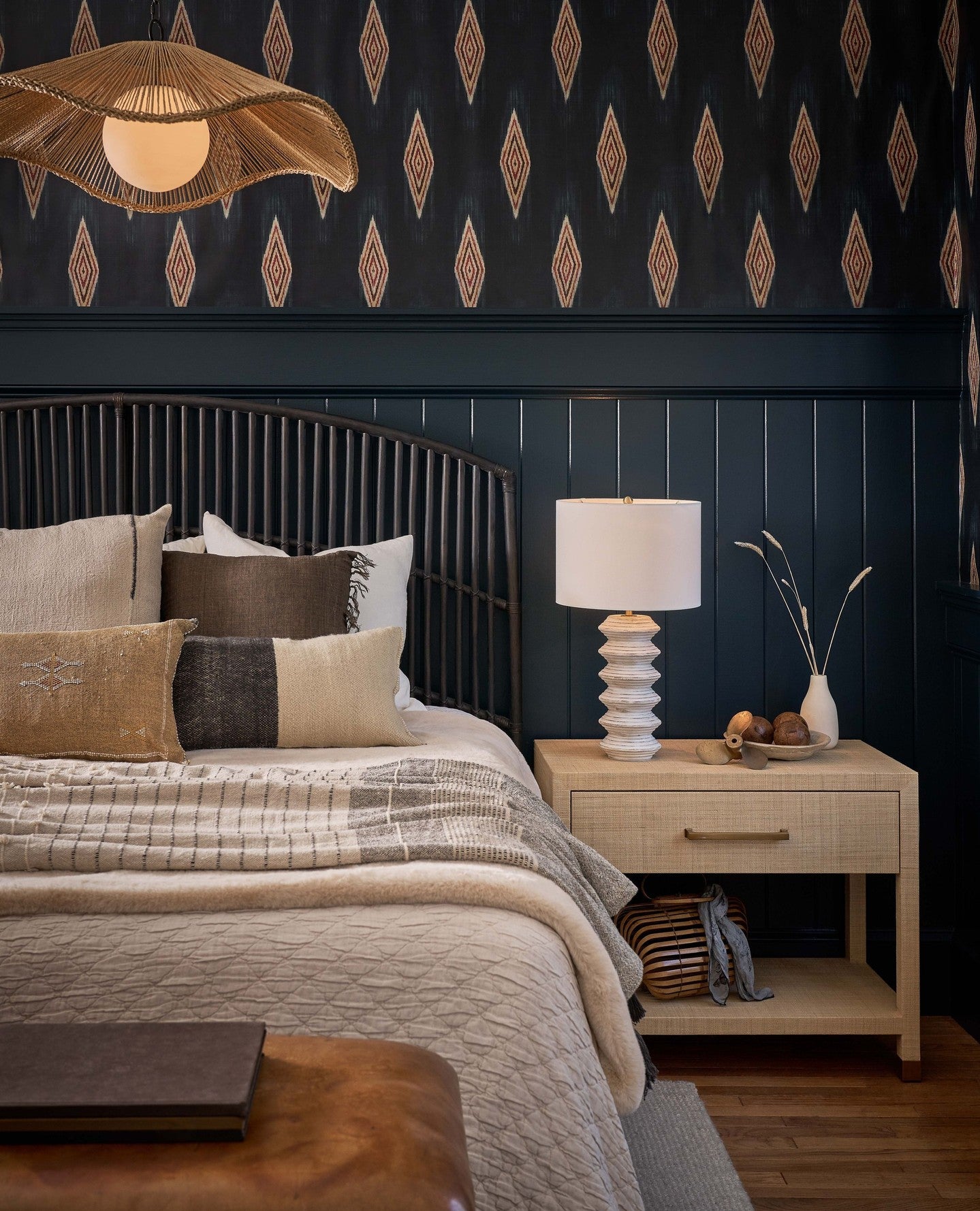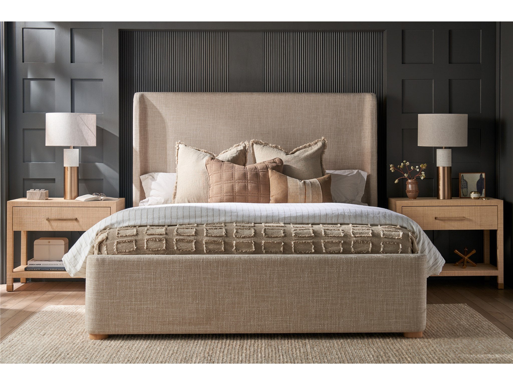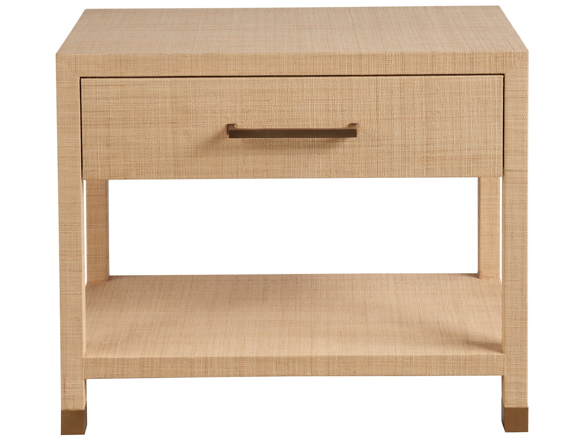 The Leah Nightstand, with its single drawer and full raffia-wrapped body, makes a textured statement in any bedroom. Bold bar hardware and leg accents add a touch of sophistication, enhancing the piece's rich texture and visual depth.