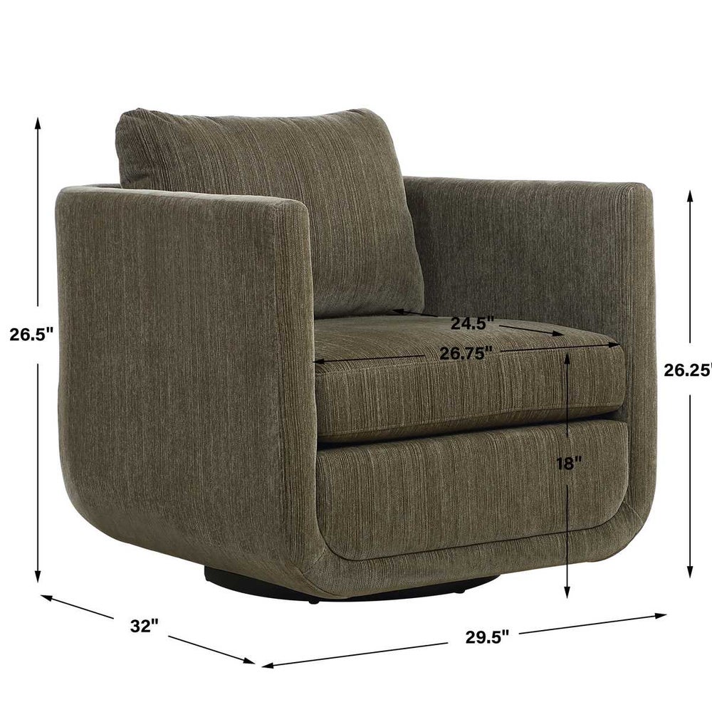 Curves abound creating style and ease, featuring a rounded frame that cradles the base and rests on a hidden swivel. Fully upholstered in rich textured chenille.