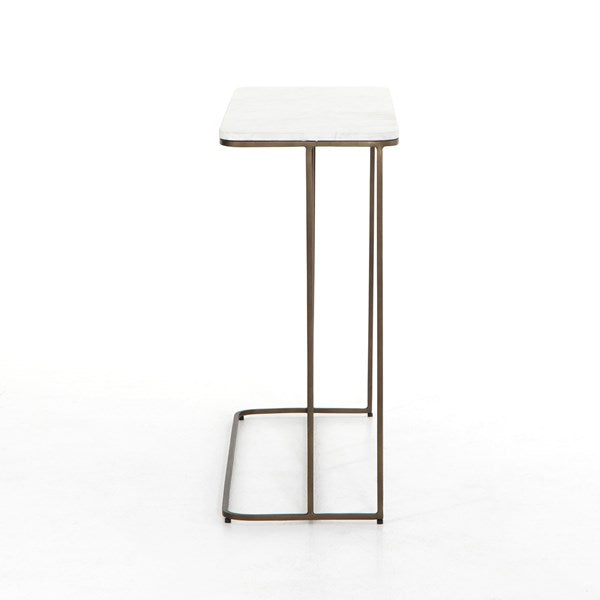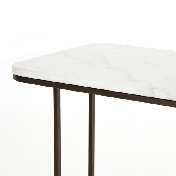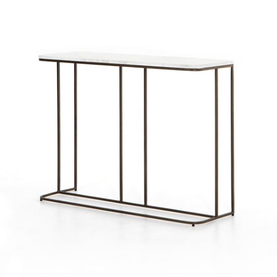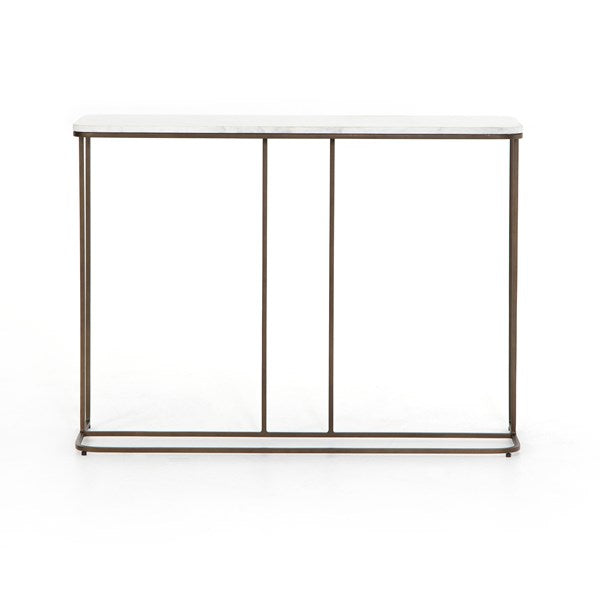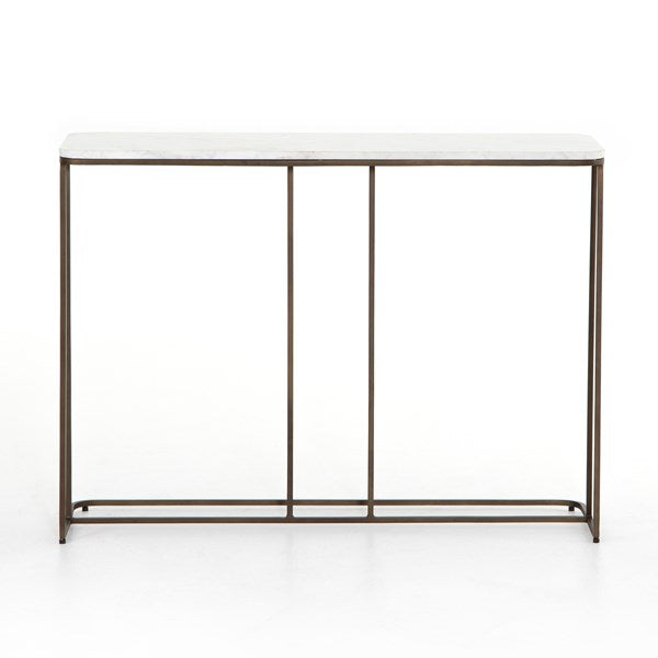 Add a pop of sophistication. Supported by slim, open framing of matte brass iron, a layer of polished white marble brings a feminine feel to modern console storage.