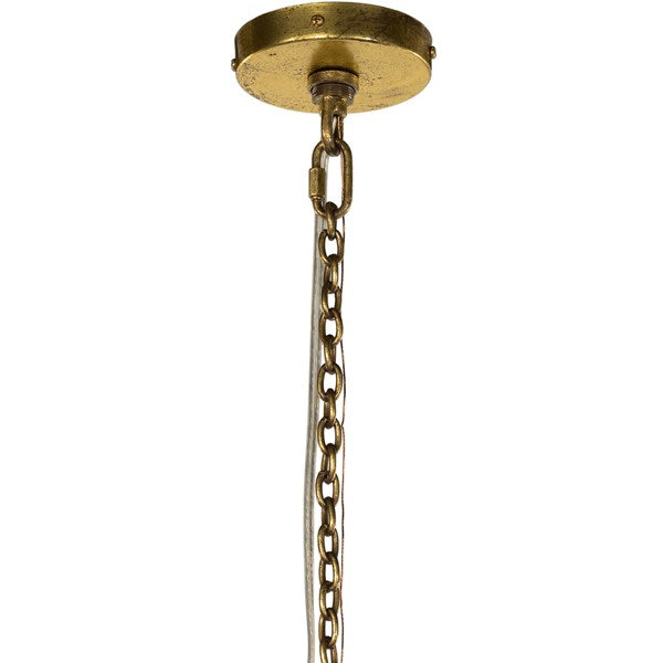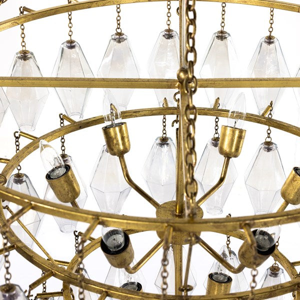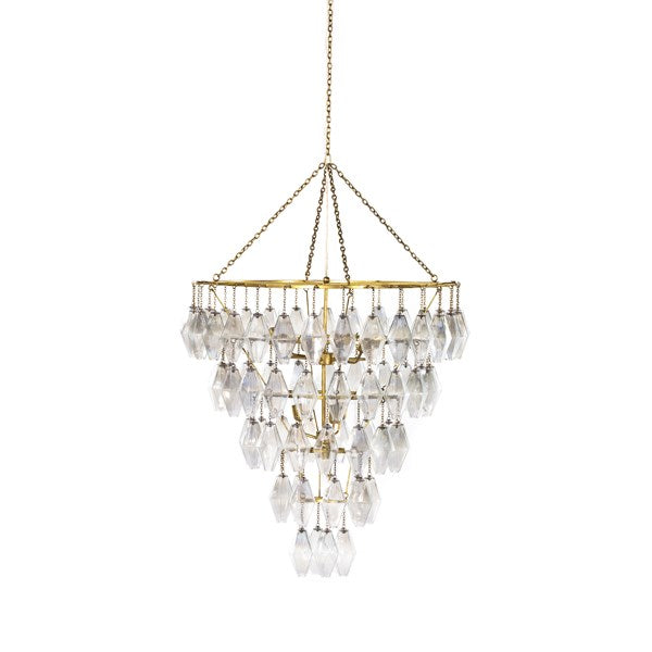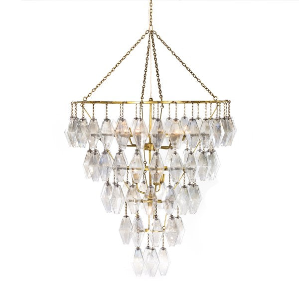 A grandly scaled "waterfall" with slightly industrial details take Hollywood glamour in a new direction. Hand-finished, iridescent glass and gold-leafed iron make a stunning statement.