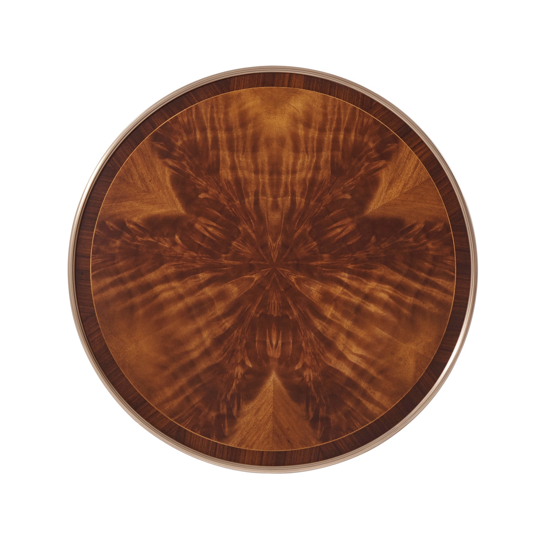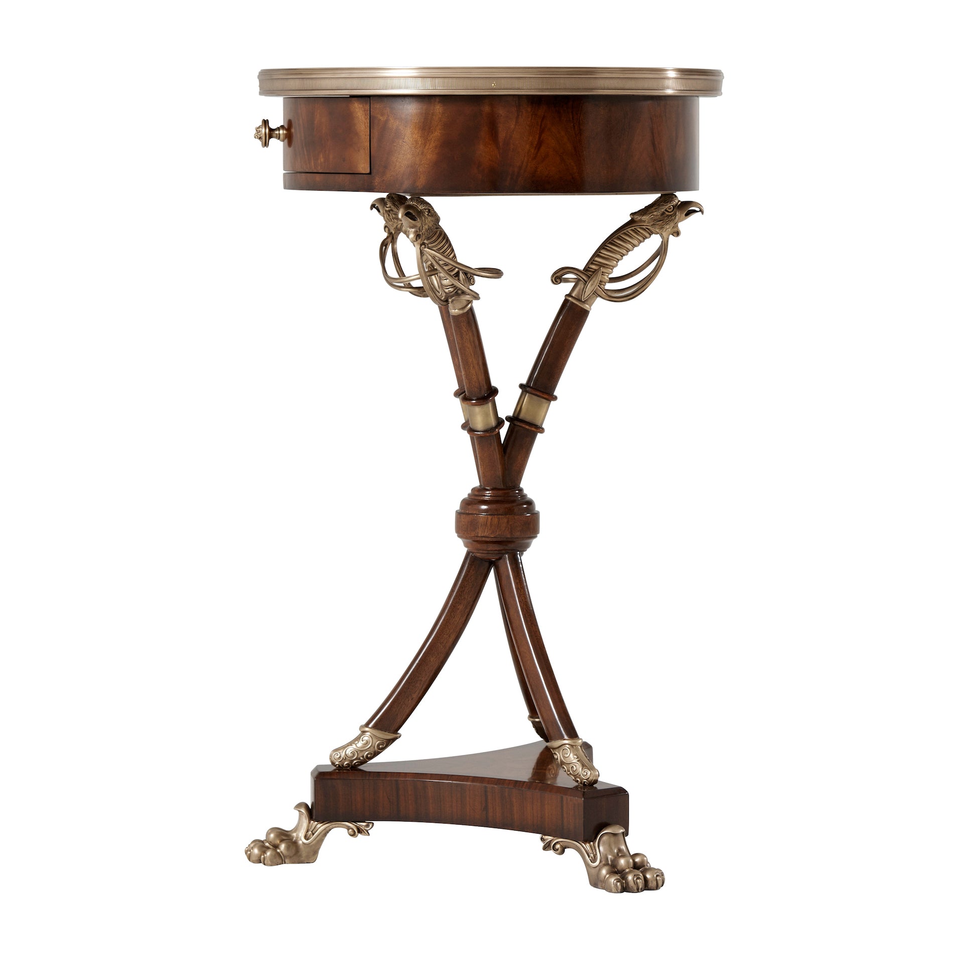A mahogany lamp table, the circular brass bound top fitted with a frieze drawer on three bound brass hilted sabres mounted on a trefoil platform base with brass lion's paw feet. Inspired by the 2nd Earl Spencer, appointed 1st Lord of the Admiralty in 1795. The original Regency.