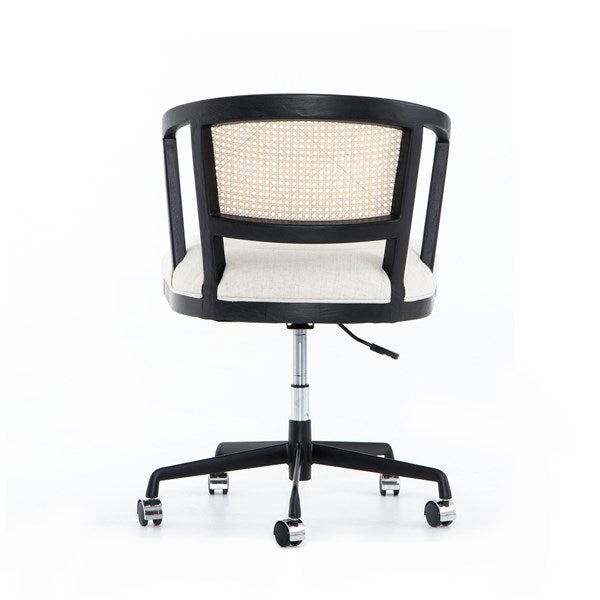 Mixed materials refresh retro office style. Brushed ebony nettle wood frames a textural inlay of natural cane, with linen-blend seating of high-performance fabric set on a handy swivel base for modern sensibility.