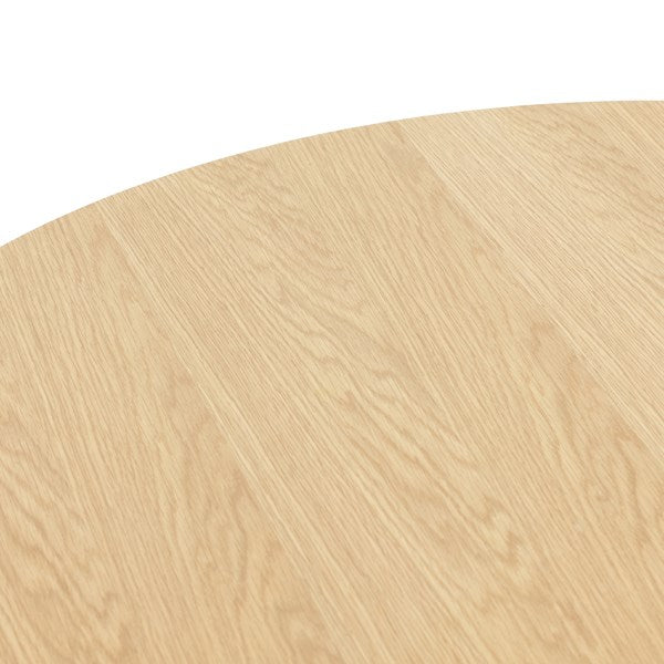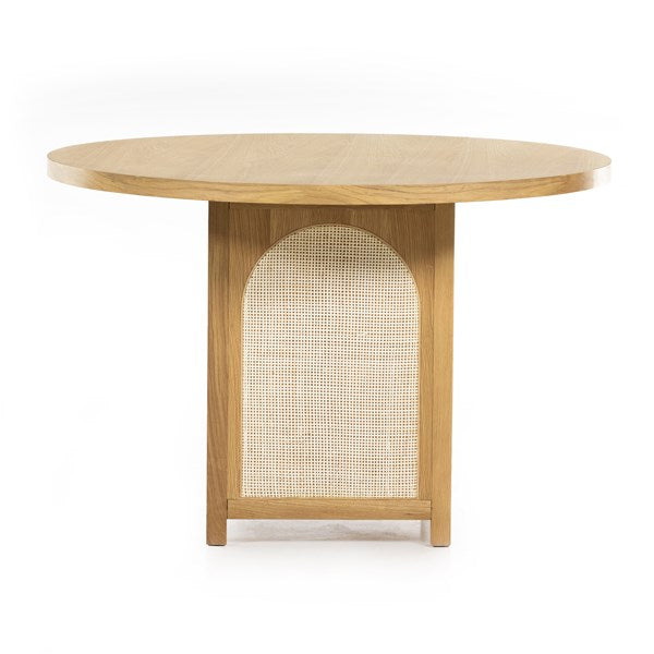Au naturale. Honey-finished oak forms a rounded tabletop and structured base featuring beautifully arched, wood-backed cane paneling for a textural twist. Option to pair with matching dining chairs.