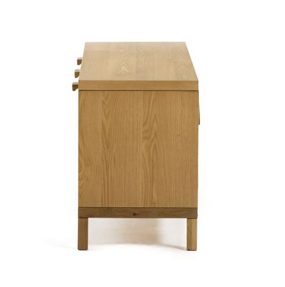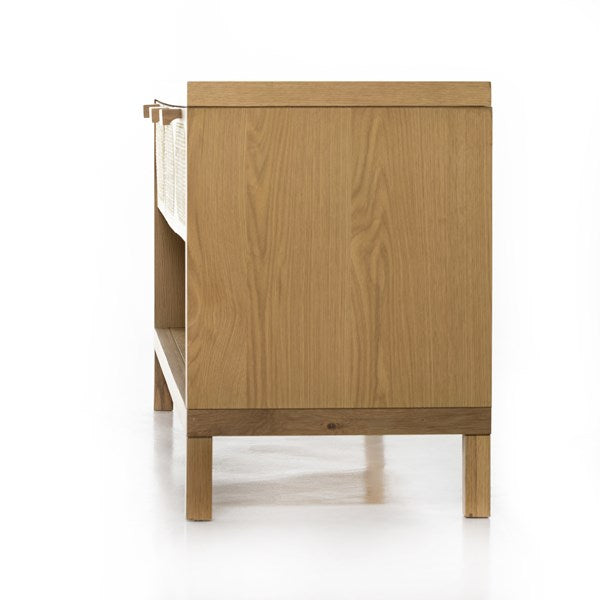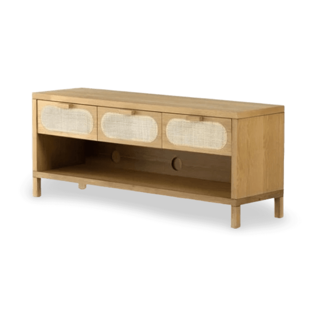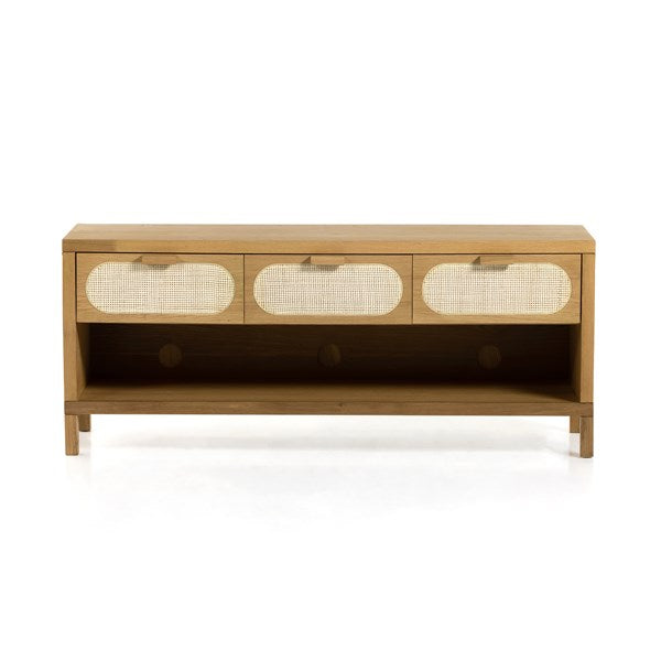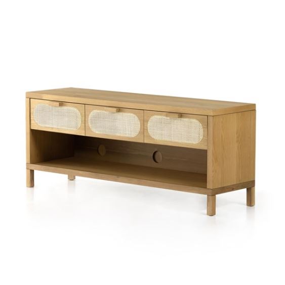 Au naturale. Honey-finished oak forms a clean-lined media console, with pill-shaped cane paneling bringing great texture to three roomy drawers. Rear cutouts for cord management.