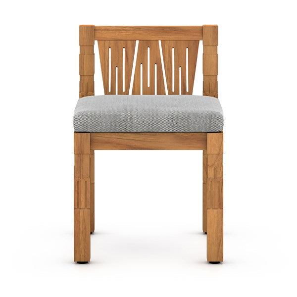 Made from FSC-certified teak with intricate CNC carving for a unique, global-spun look, Velcro-secured seating in a textural ash. Cover or store indoors during inclement weather and when not in use.