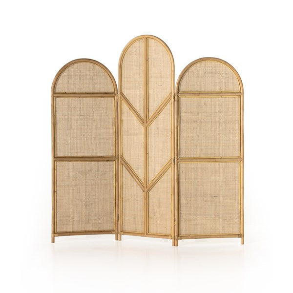 Woven natural rattan complemented by cane framing. Soft arches are contrasted by bold angles, accented with an inset border.