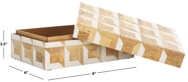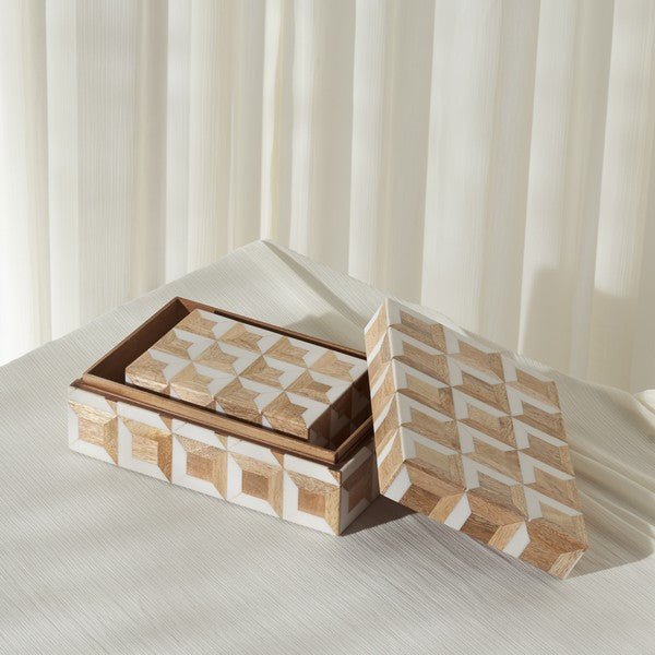 Each box boasts a distinctive geometric pattern, lending a sense of sophisticated charm and texture to your room decor. The varied wood shades, from the light hues of the mango wood to the deeper tones found in the MDF components, create an eye-catching mosaic that highlights the natural beauty and subtle differences in the wood grains.