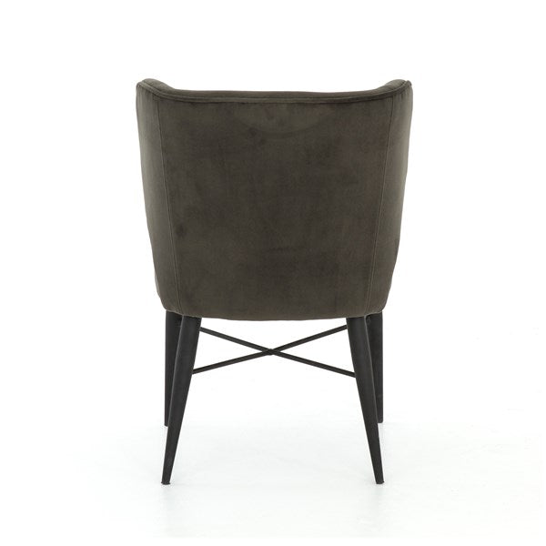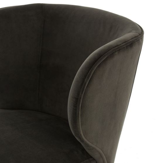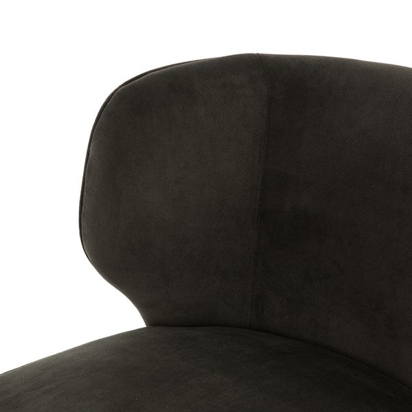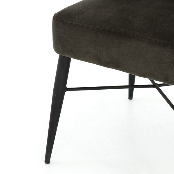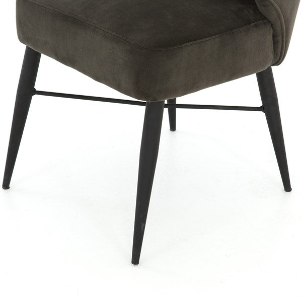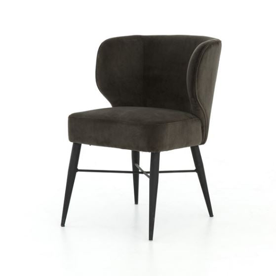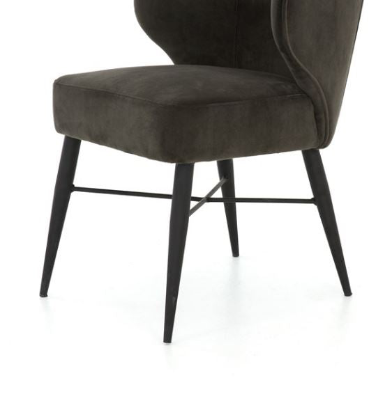 A low, curved back reimagines the classic wingback. Angular iron legs are cone-tapered, supporting snug-fit seating in an inviting smoke hue.