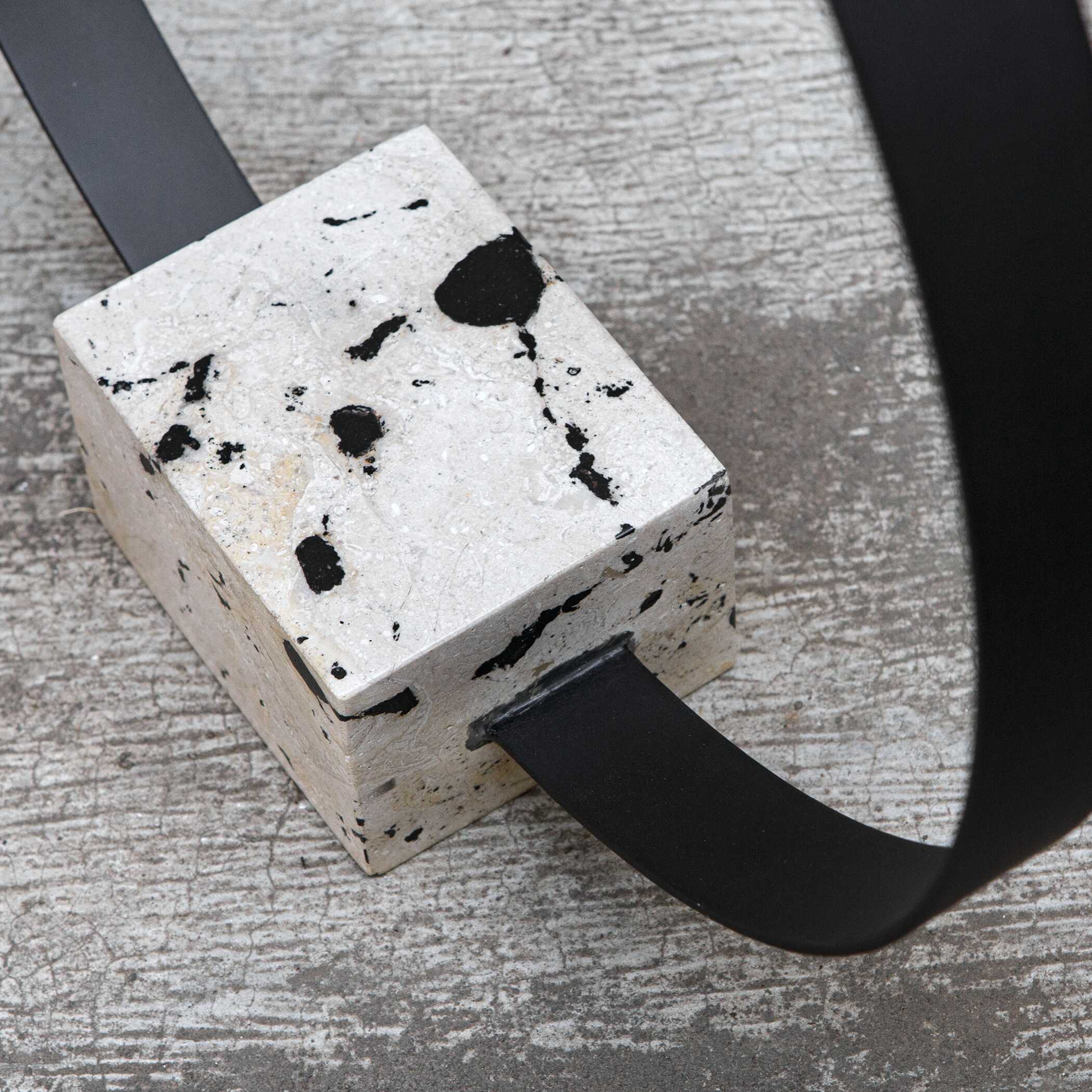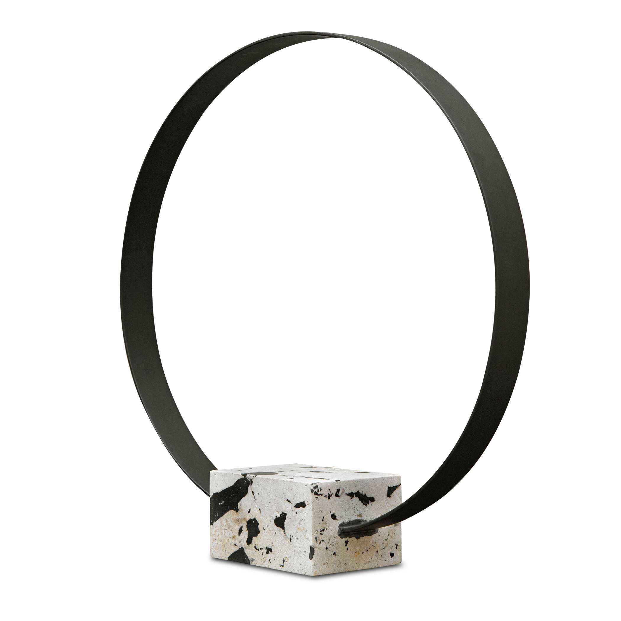 This Circular Metal Sculpture Is Finished In A Brushed Satin Black Anchored By A Natural White Coral Stone Base With Black Accents.
